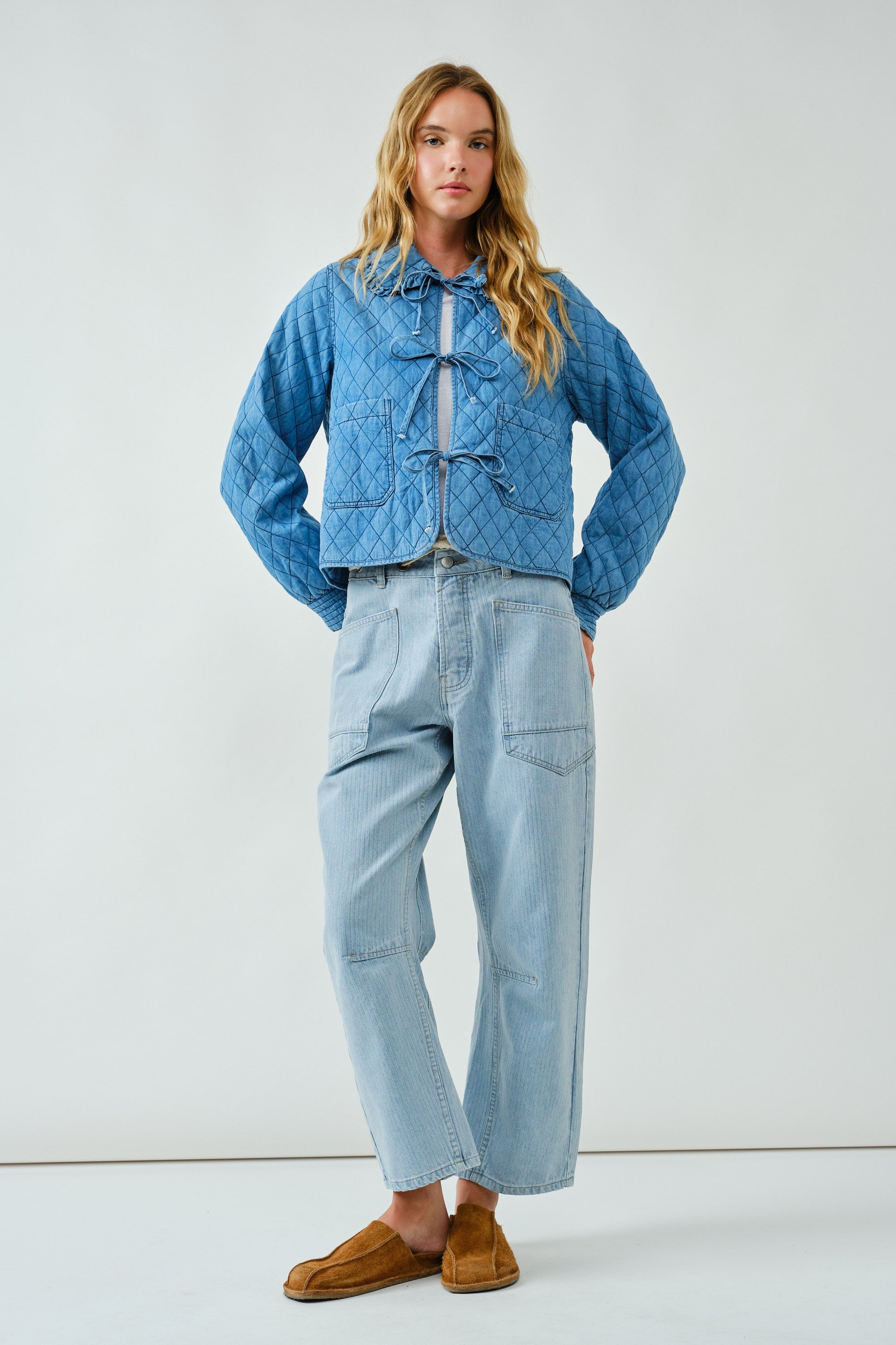 Full body view of Chloe Bow Quilted Denim Jacket in denim, styled casually with relaxed fit