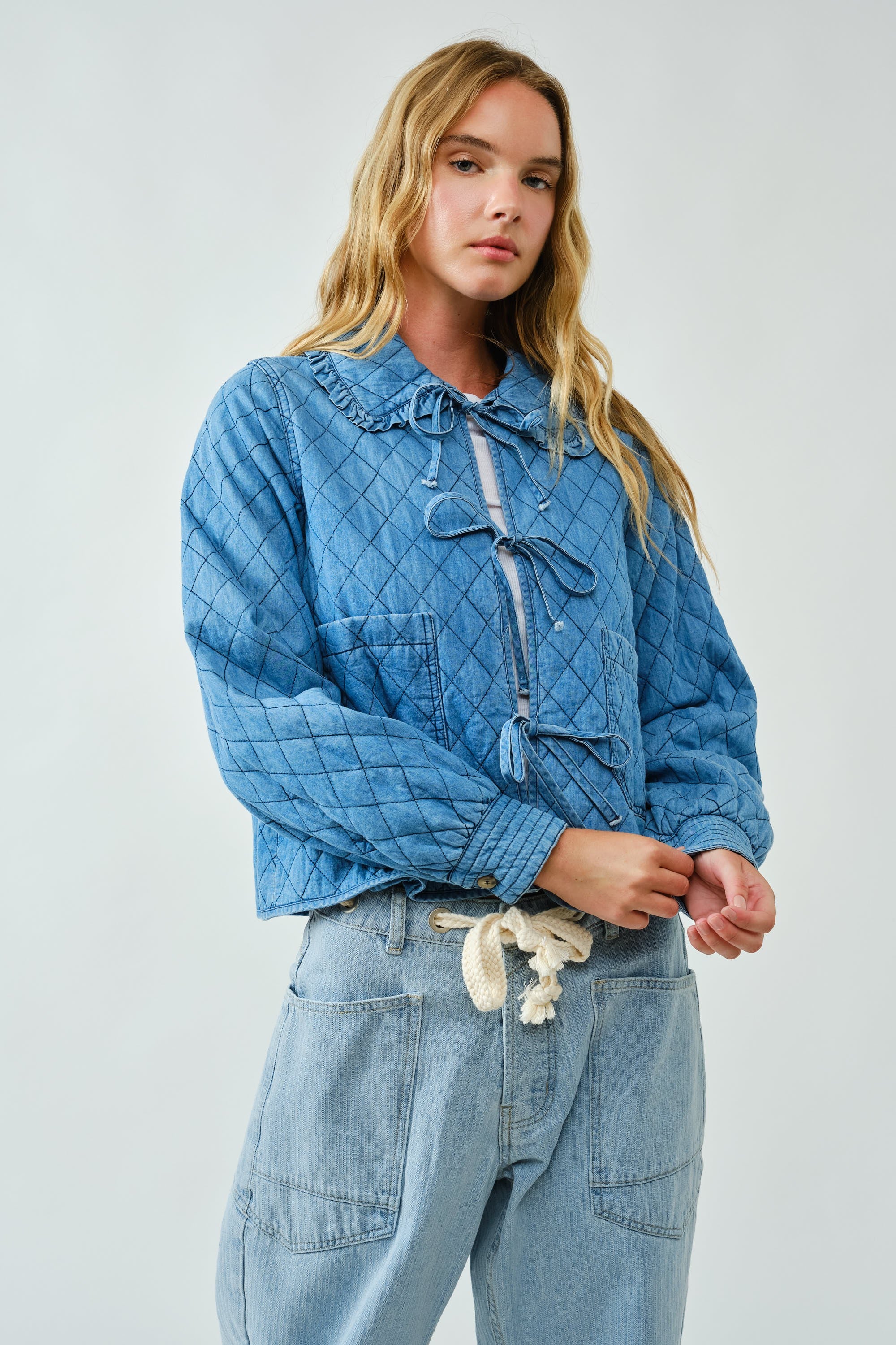 Woman wearing Chloe Bow Quilted Denim Jacket in denim with quilted texture, bow tie closure, and lace Peter Pan collar