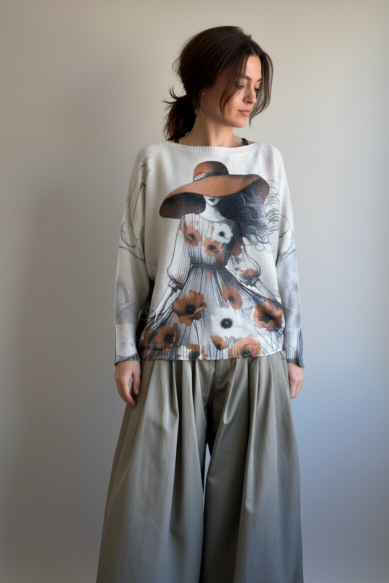 Livia Made in Italy Batwing Printed Sweater - Lady in Hat