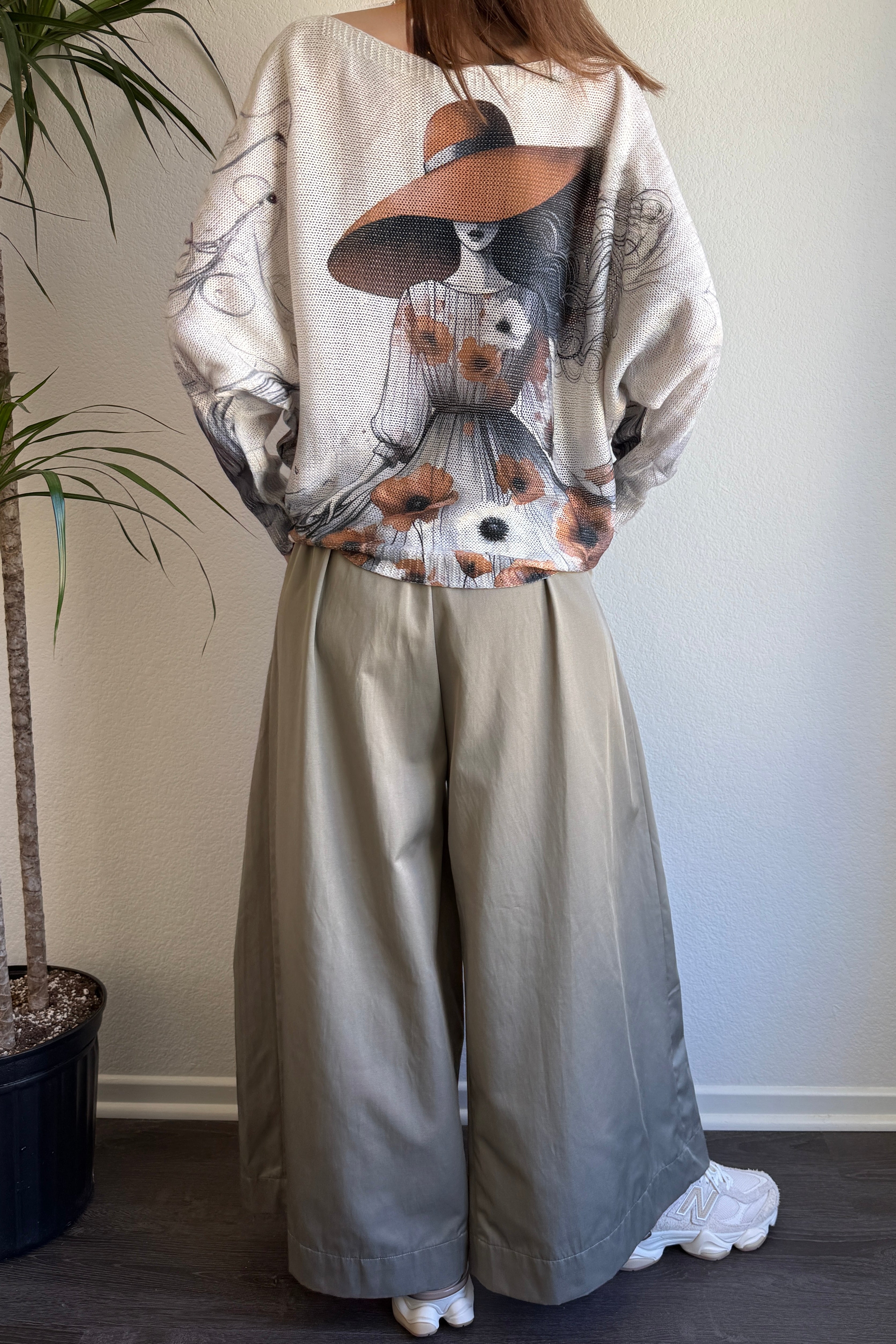 Side view of the batwing printed sweater showing drape and relaxed silhouette
