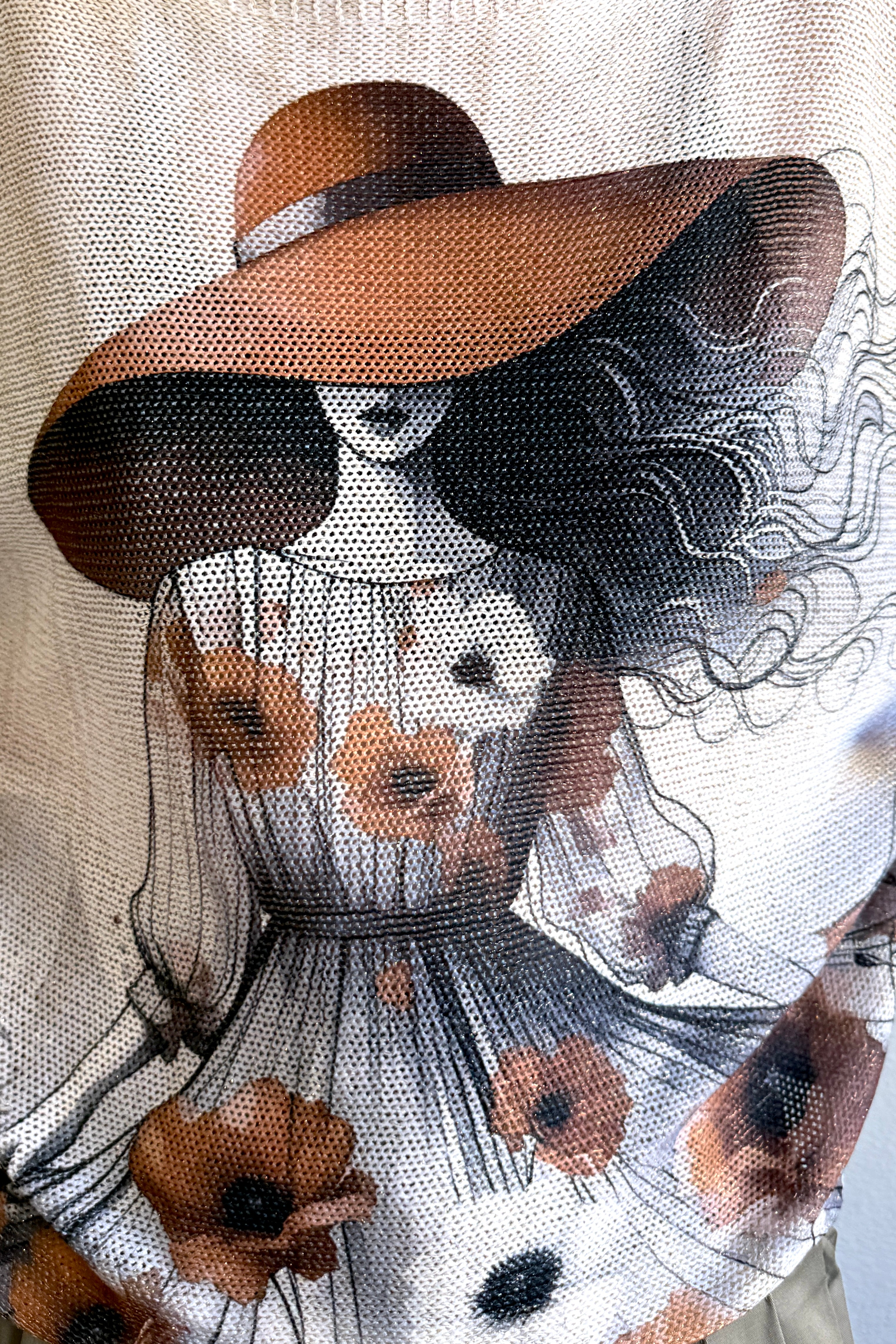 Close-up detail of the Lady in Hat print on the Livia batwing sweater