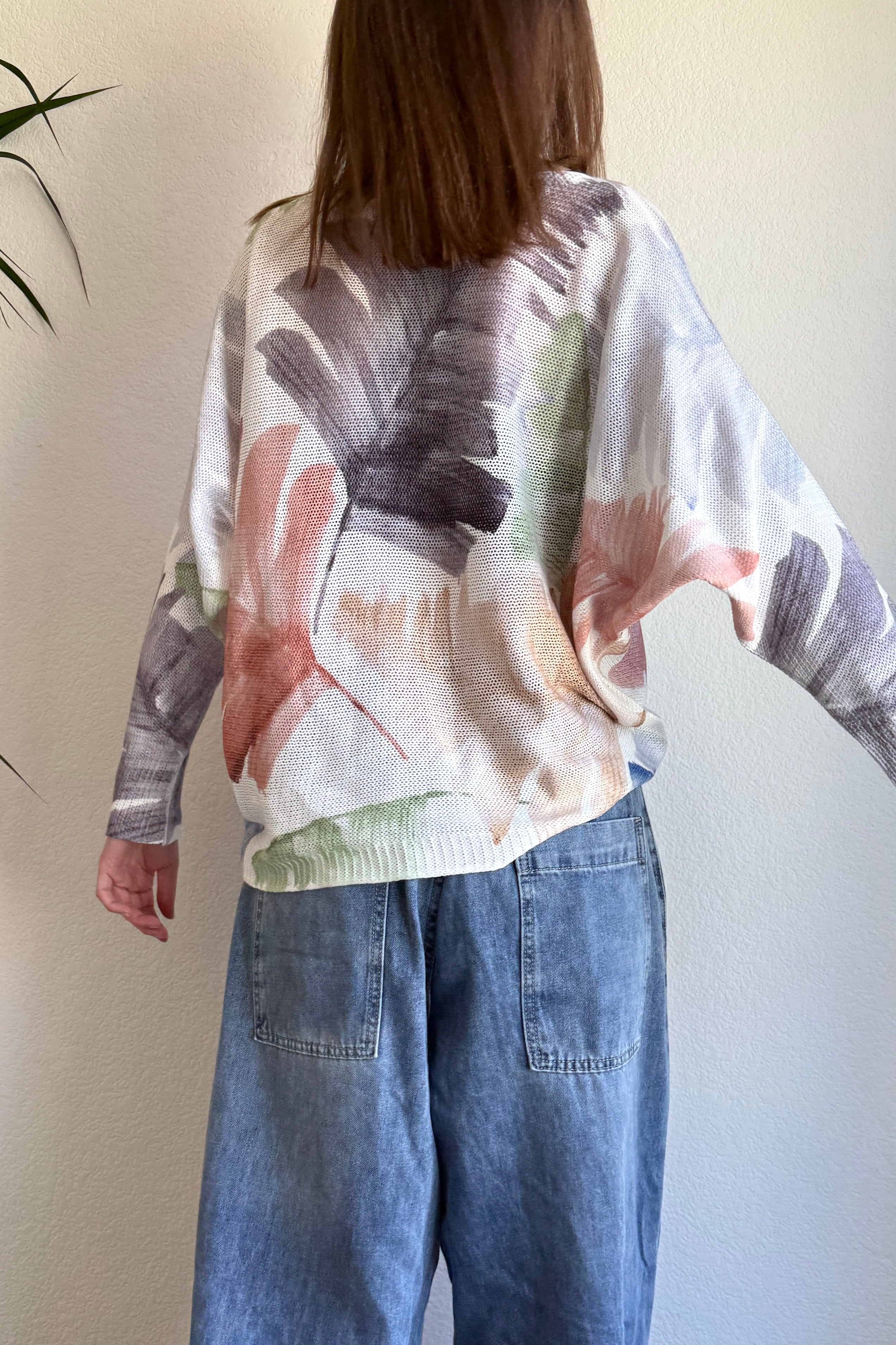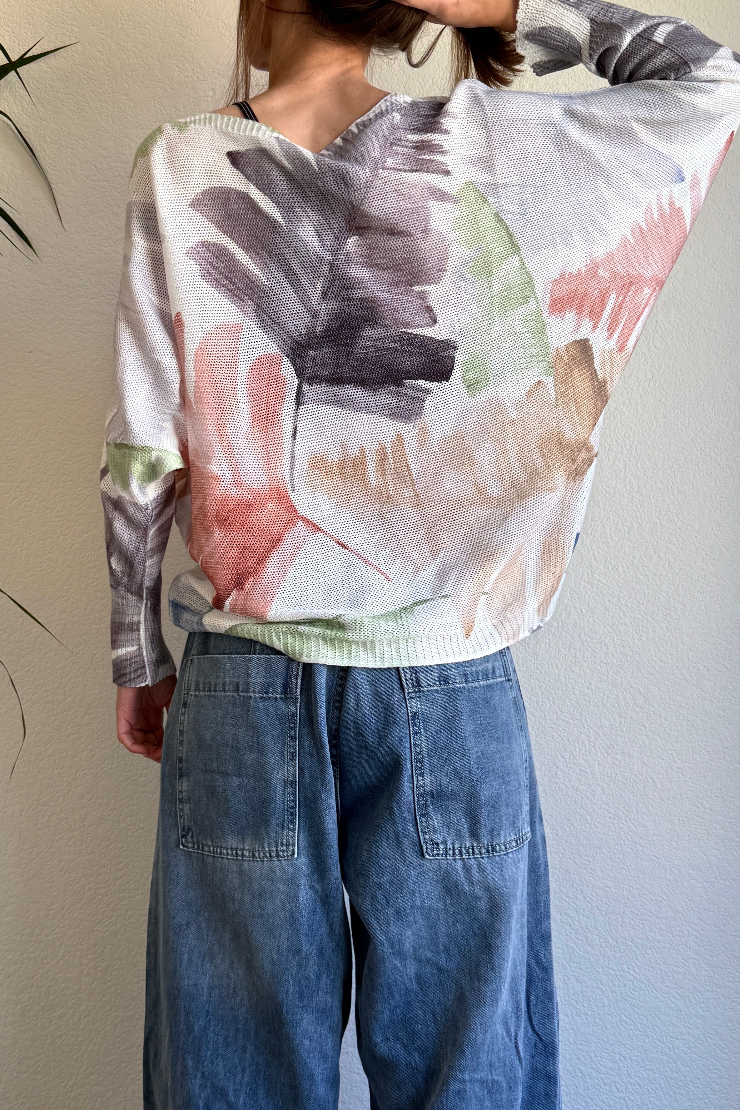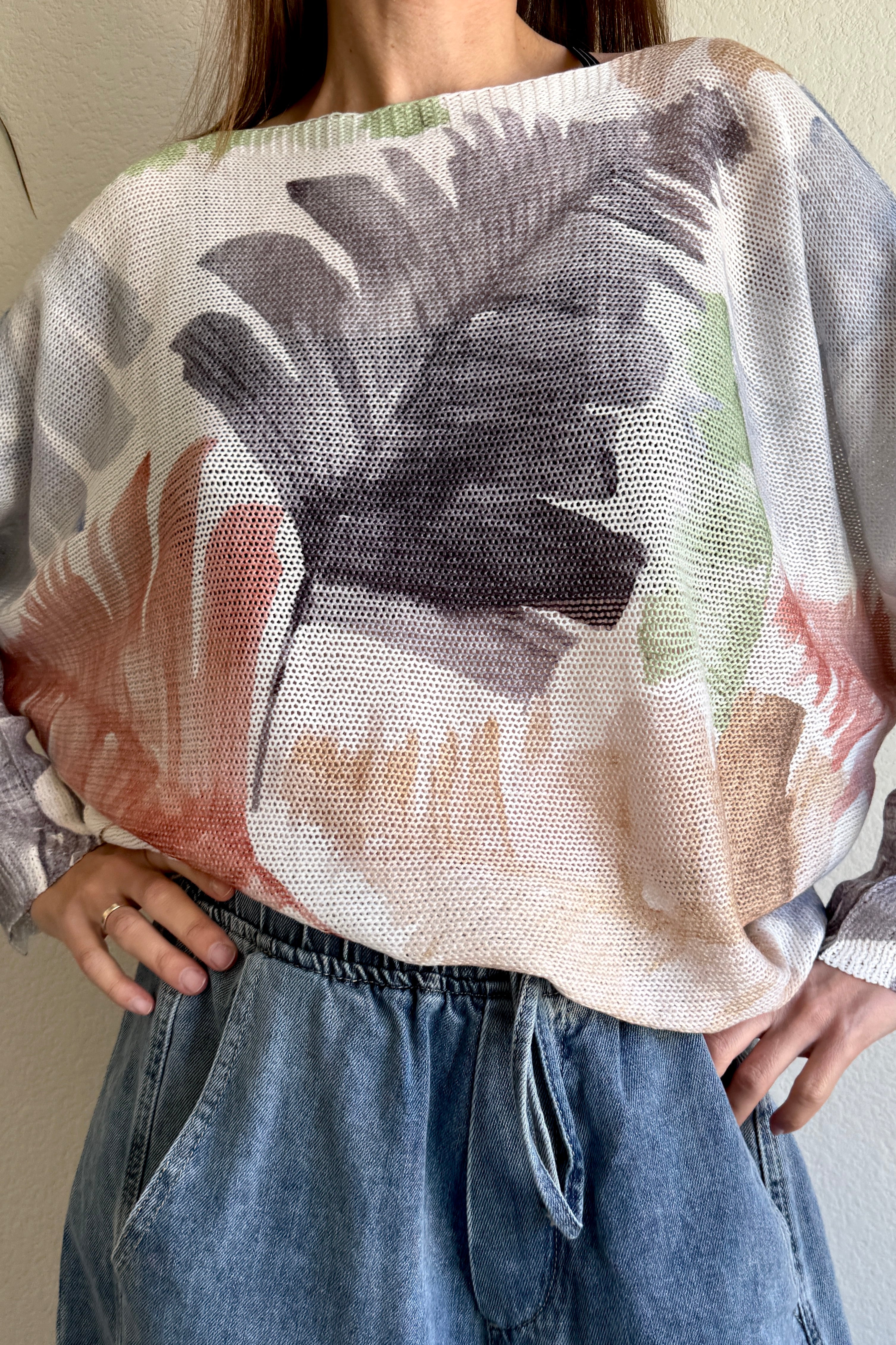 he Livia Made in Italy Batwing Printed Sweater in the Watercolor Palm Multi print is an effortless, lightweight knit that brings a fresh, casual feel to everyday outfits. Made in Italy from a soft, airy yet cozy fabric, it features a relaxed batwing silhouette with 3/4 sleeves for a flattering, easy drape. The double-sided watercolor palm print adds a soft, artistic statement from every angle while keeping the look relaxed and wearable.
