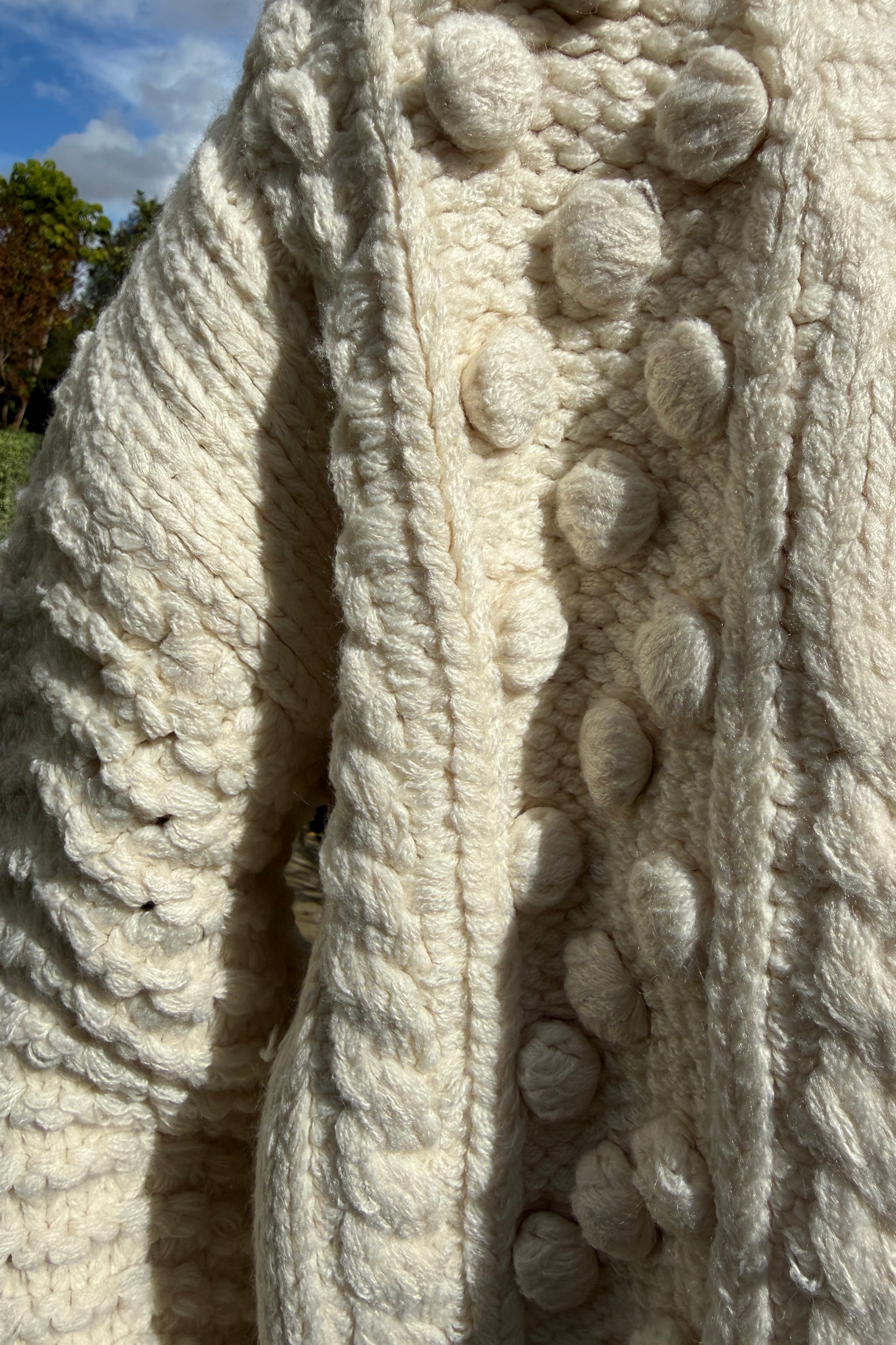 Close-up detail of the popcorn stitch texture on the ivory chunky knit cardigan