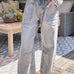 Close-up detail of waist eyelet design and drawstrings on the rust jeans
