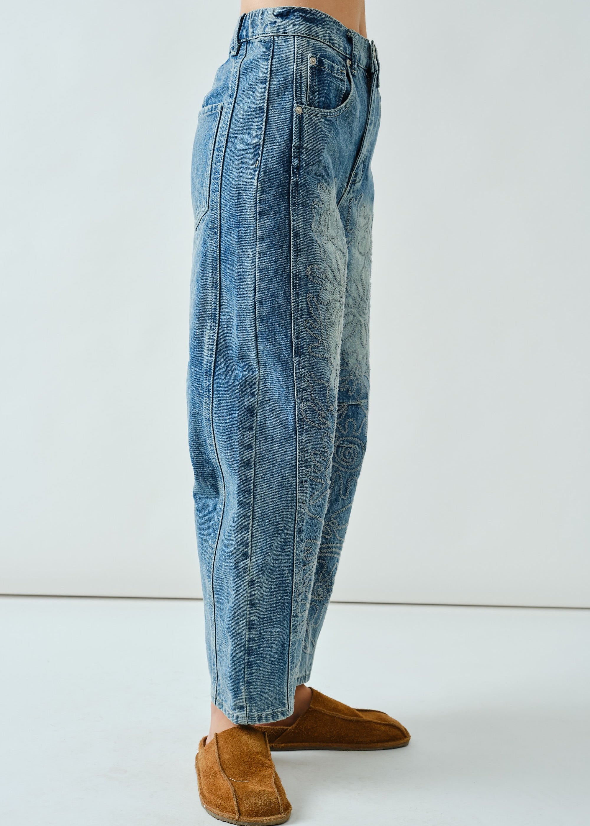 Floral Embroidered Barrel Leg Jeans - Medium Wash - FINAL SALE