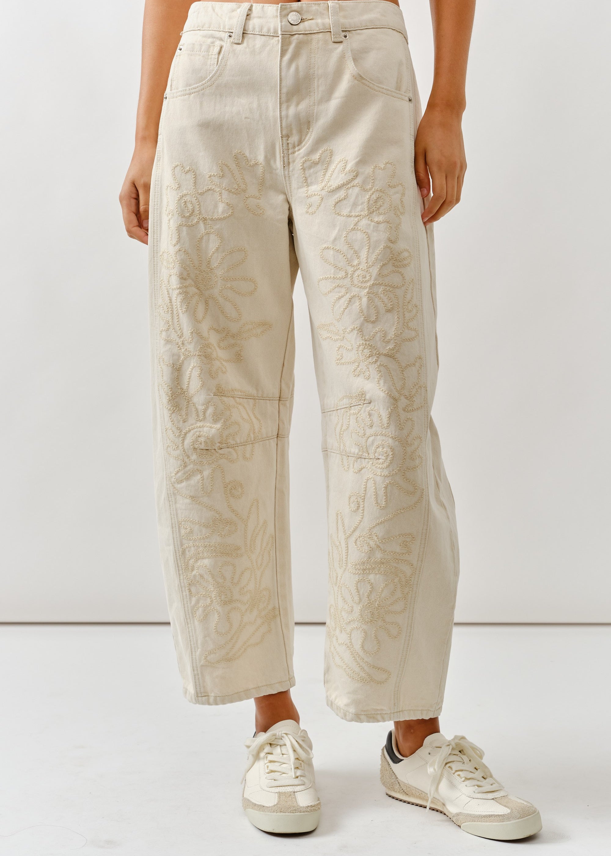 Floral Embroidered Barrel Leg Jeans - Beige - FINAL SALE