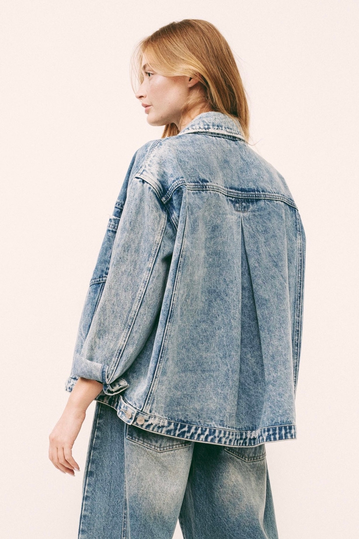 Experience the perfect blend of style and comfort with this denim jacket, featuring dropped shoulders and unique back pleating for a playful touch. It’s oversized but perfectly balanced.