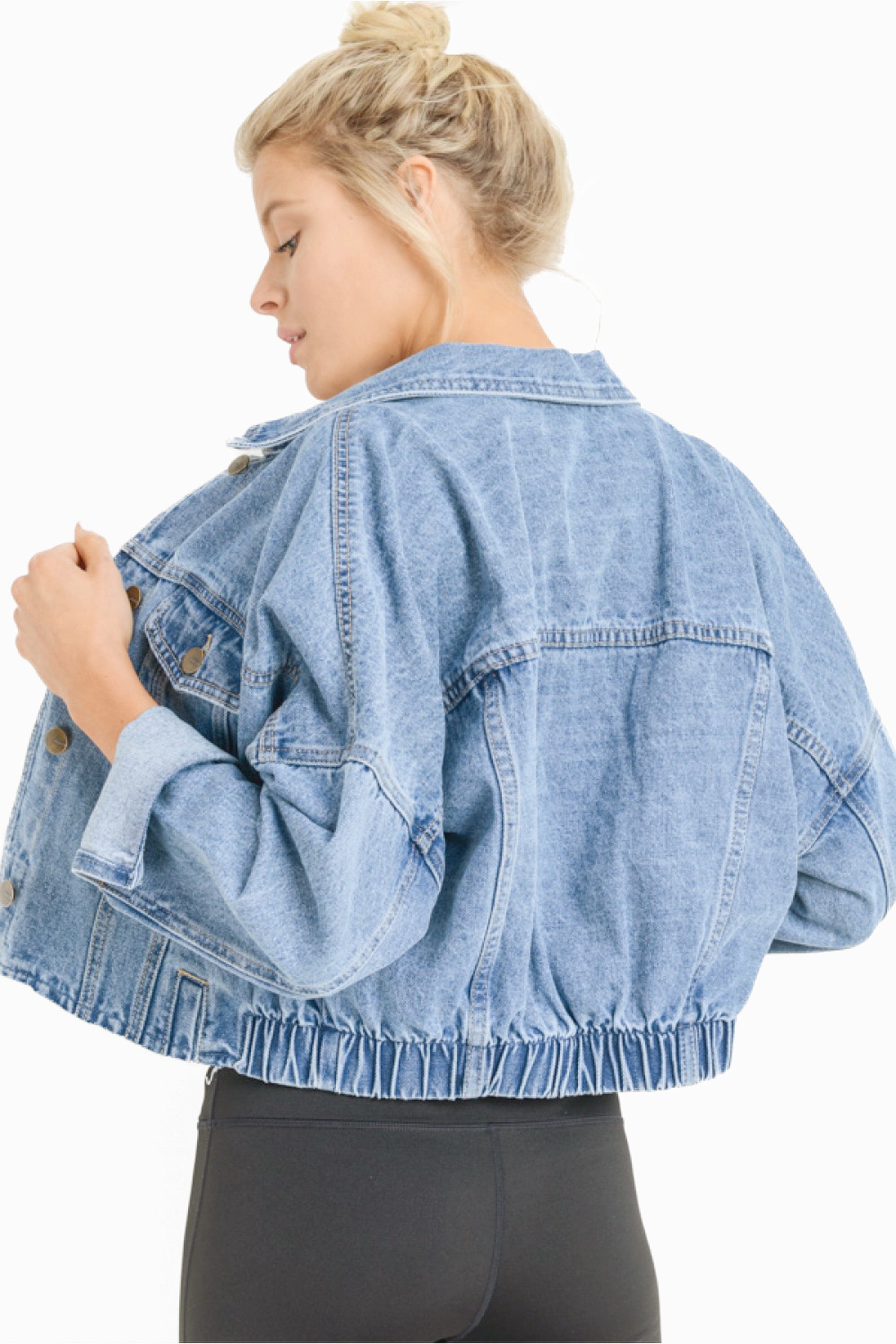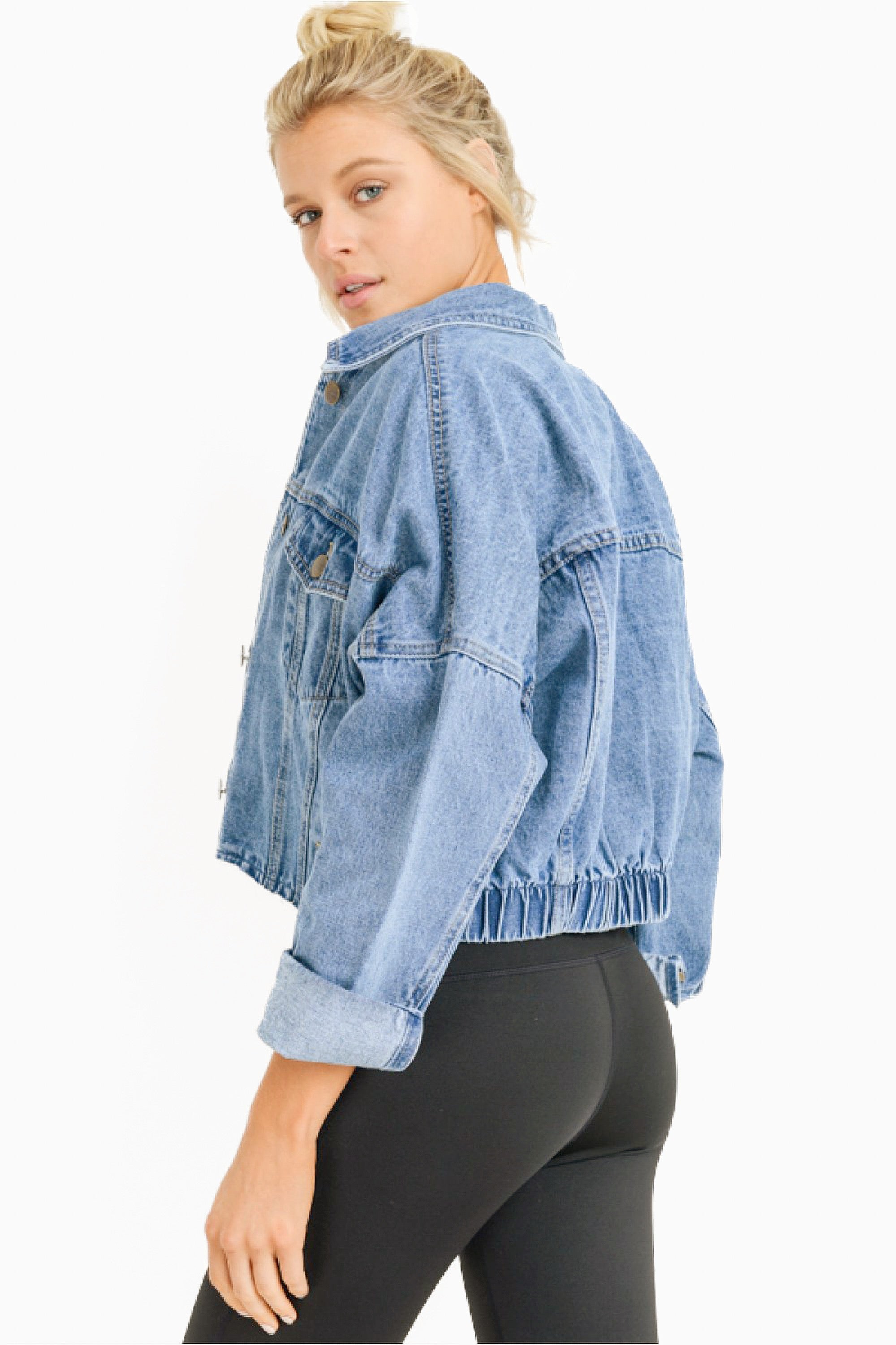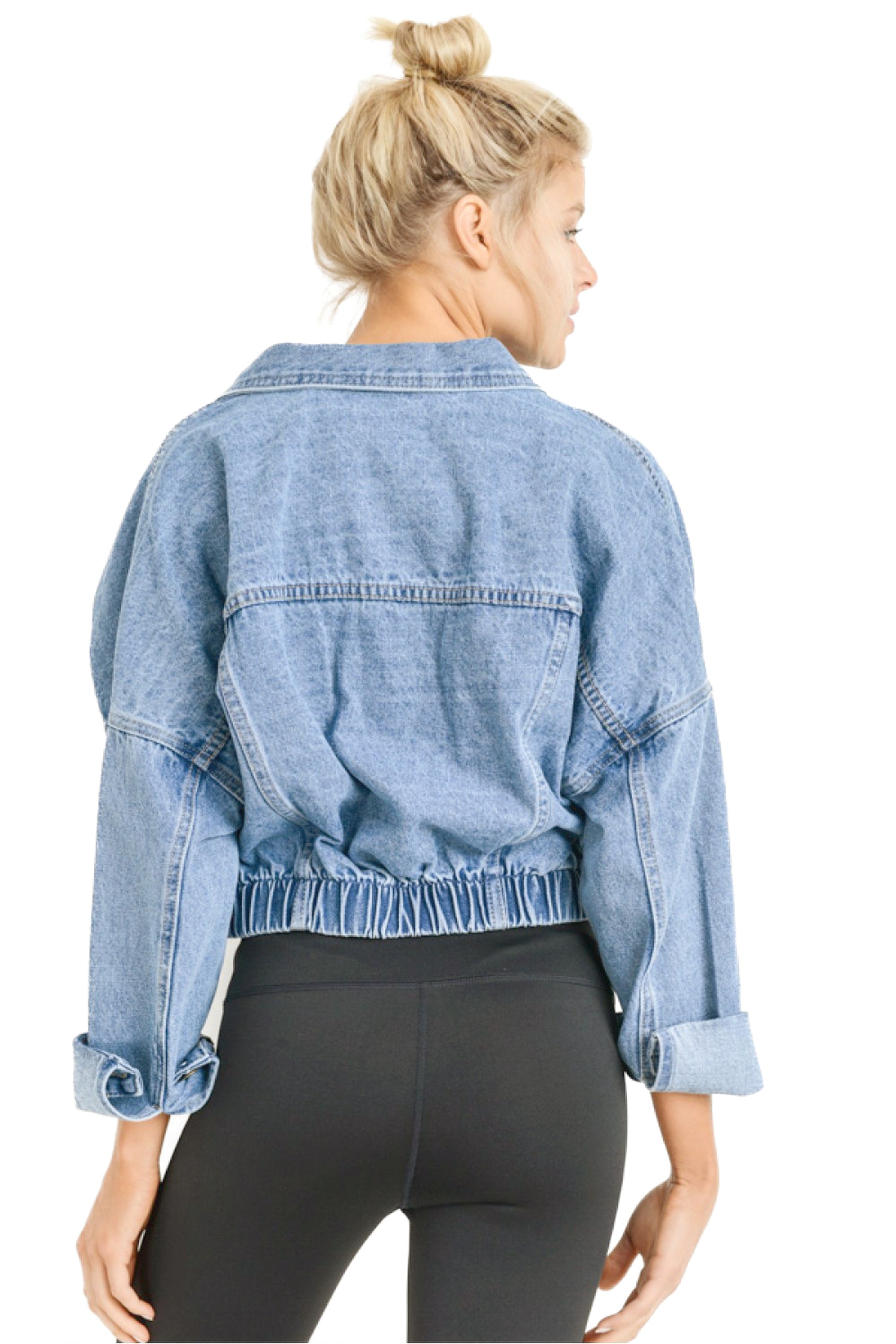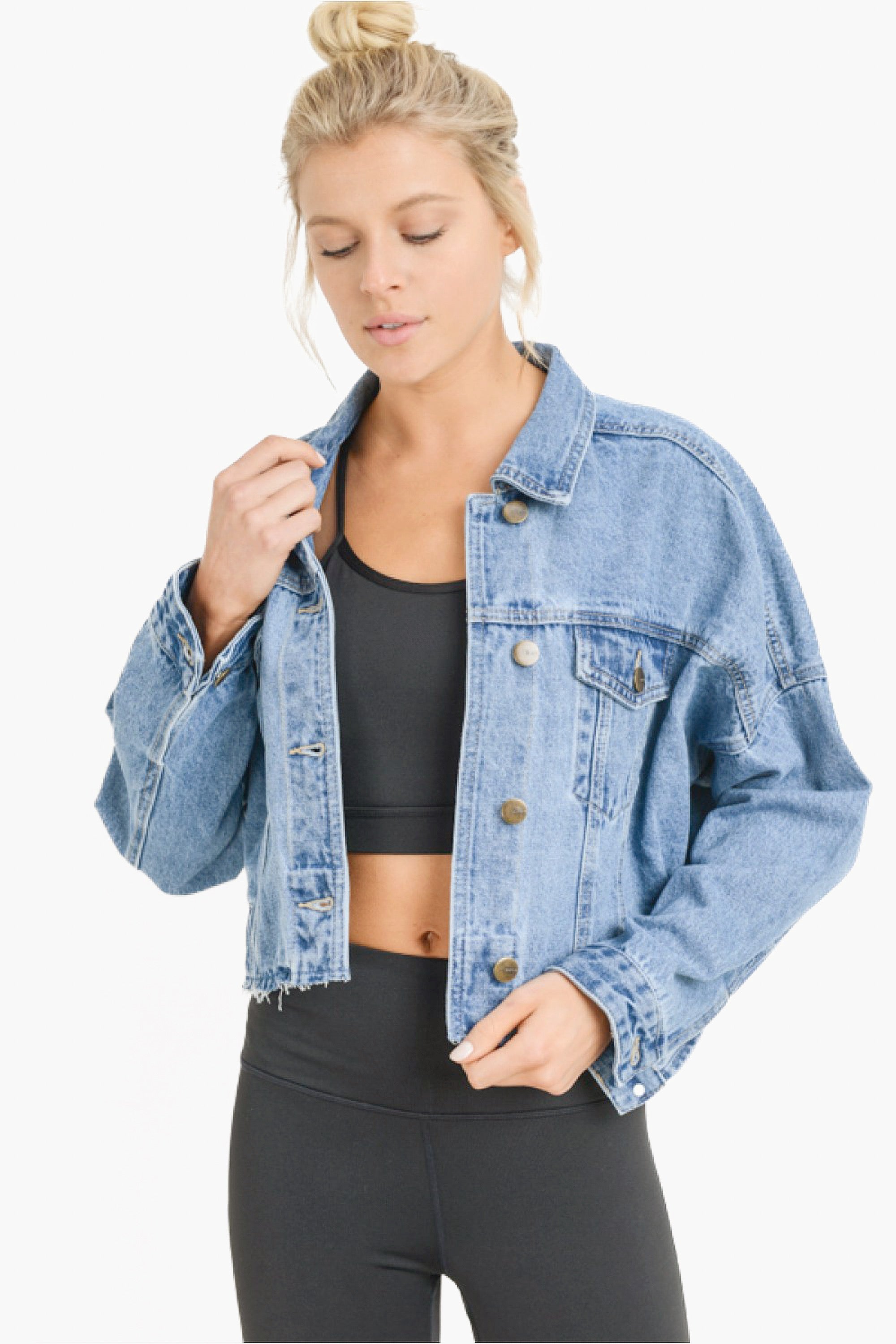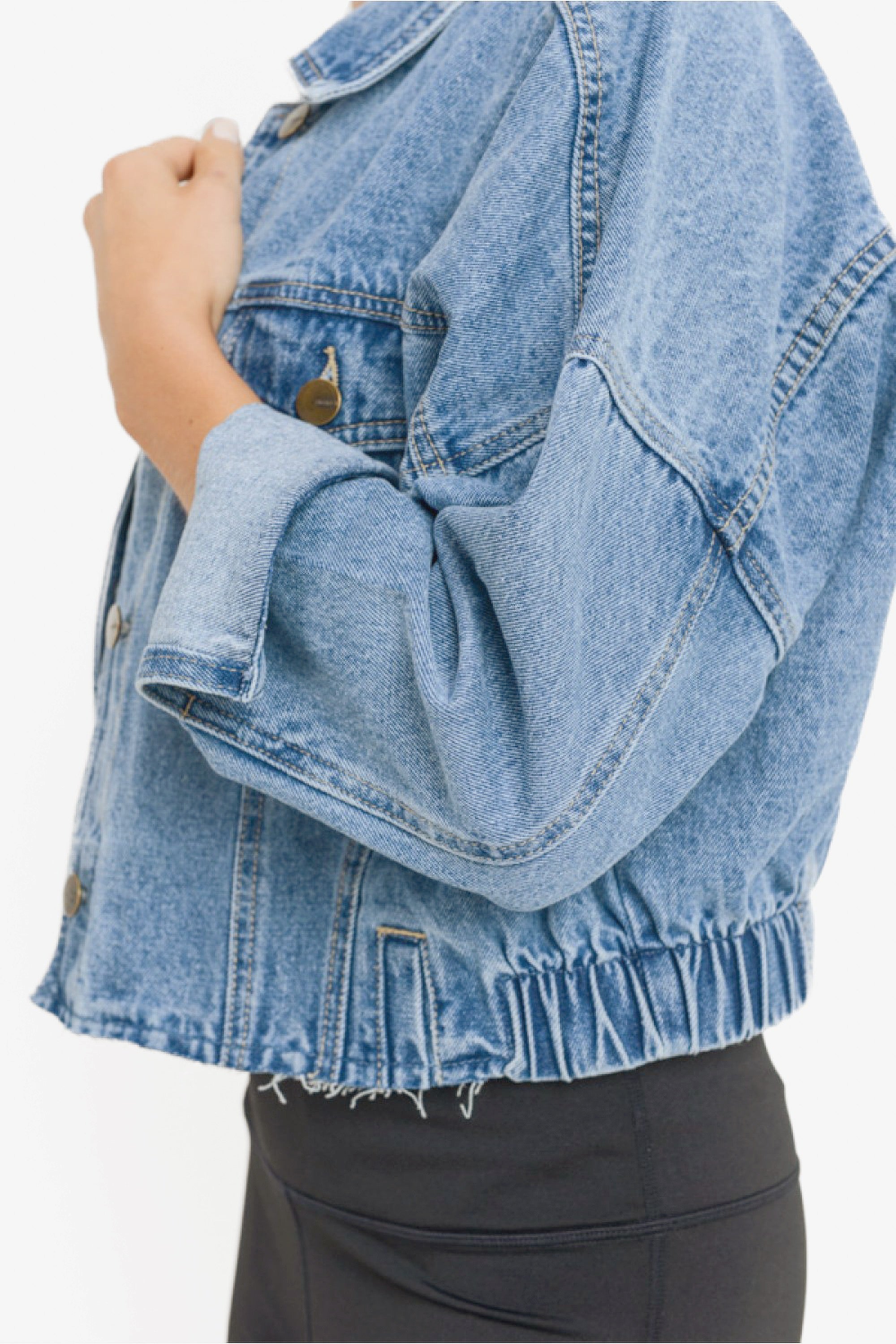 This denim jacket is great for layering over activewear and looks equally stylish with casual outfits. It has a shorter length, long drop sleeves, and a mix of raw edges and ribbed accents on the bottom hem, adding a trendy touch to your look.