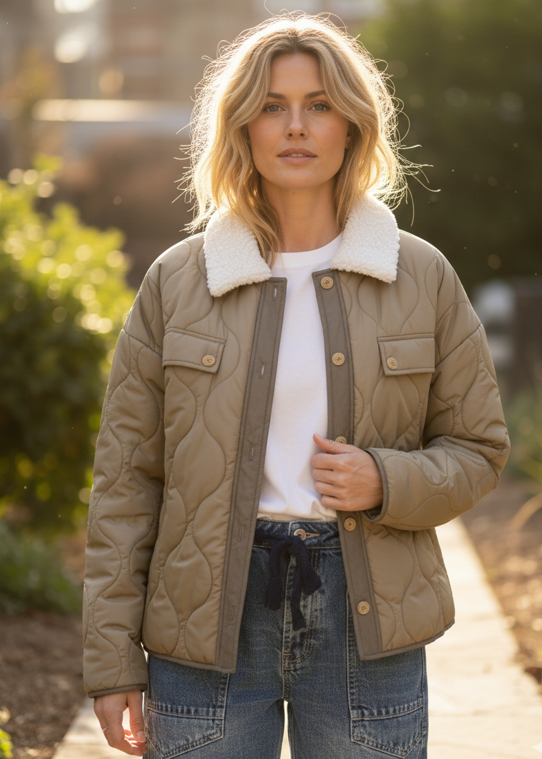 Aura Sherpa Collar Quilted Puffer Coat – Olive