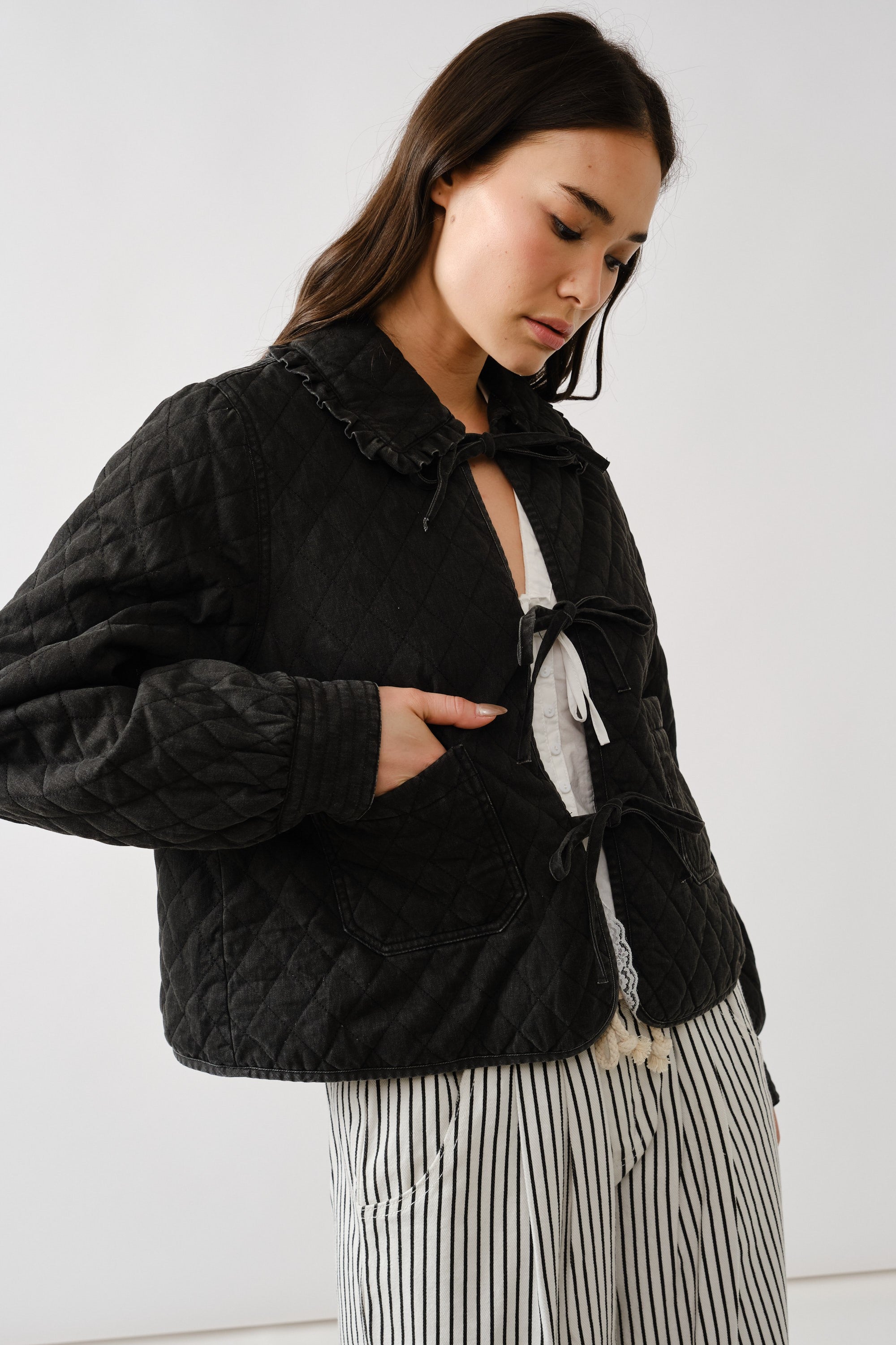 The Chloe Bow Quilted Denim Jacket – Black is a charming blend of cozy comfort and feminine detail. Designed for cool days, this quilted denim jacket features a soft, breathable cotton feel with a relaxed fit that’s easy to layer. The delicate lace-trimmed Peter Pan collar adds a romantic touch, while bow tie front closures bring a playful, on-trend finish to this timeless silhouette.