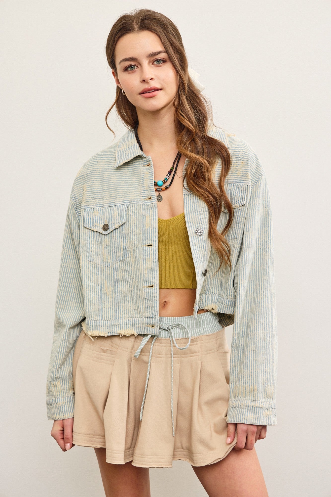 The Distressed Hem Striped Denim Jacket in sand wash is an easy statement layer that brings effortless edge to everyday outfits. Made from soft striped denim, this women’s jacket has a relaxed fit with dropped shoulders for a comfortable, laid-back feel. The lightly distressed hem and details add a subtle vintage vibe, while the cropped length keeps the look modern and flattering.