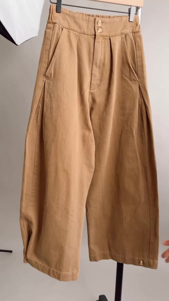 The Nash Wide-Leg Pleated Pants combine comfort and effortless style, crafted from washed cotton for a laid-back, yet polished look. With a super wide-leg design and pleating at the top for added shape, these pants also feature an elastic back waist for extra comfort and a button at the bottom to taper the fit when desired.