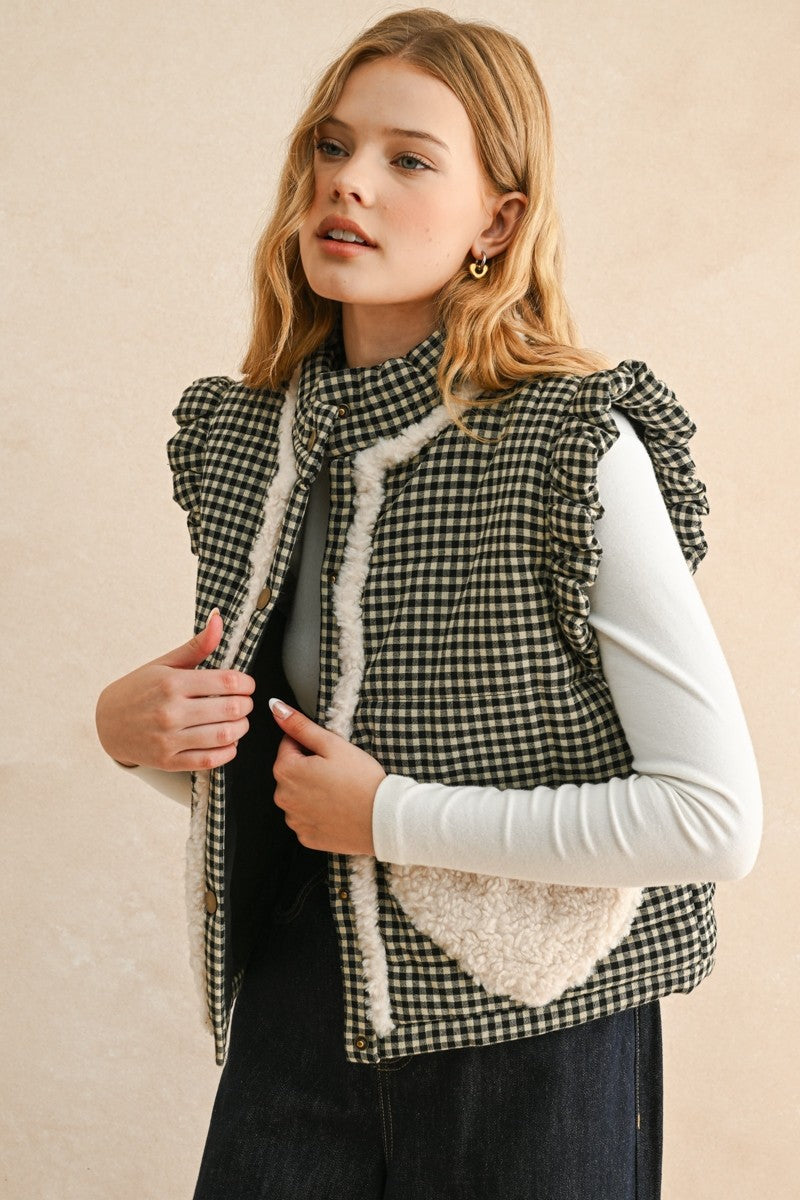 Rosie Gingham Sherpa Puffer Vest - Black