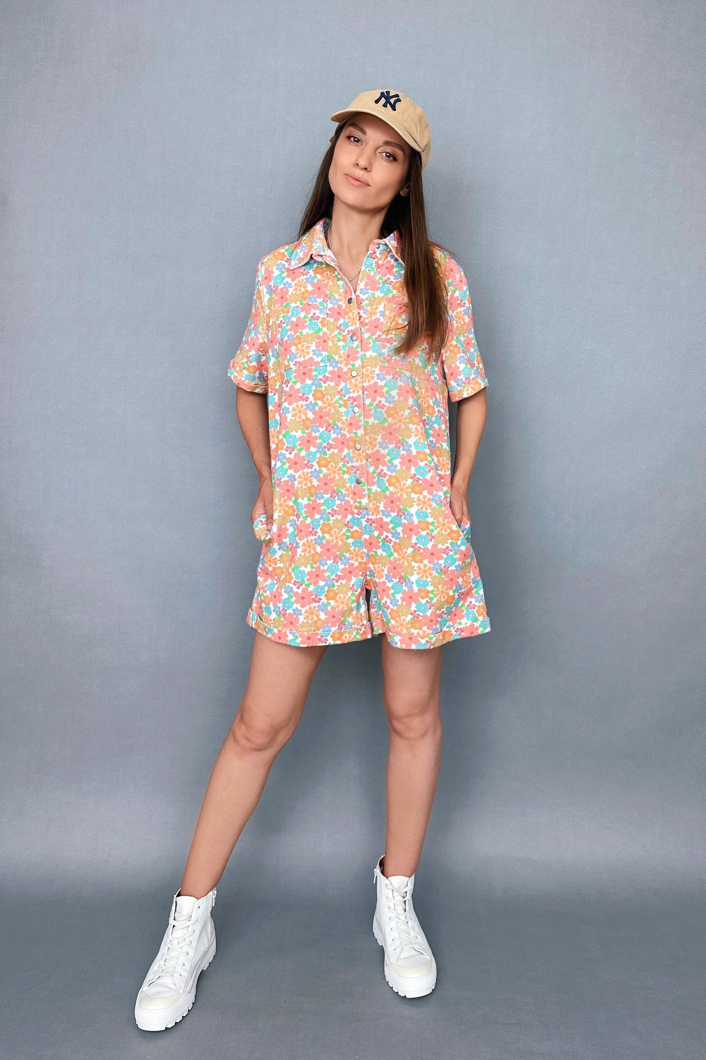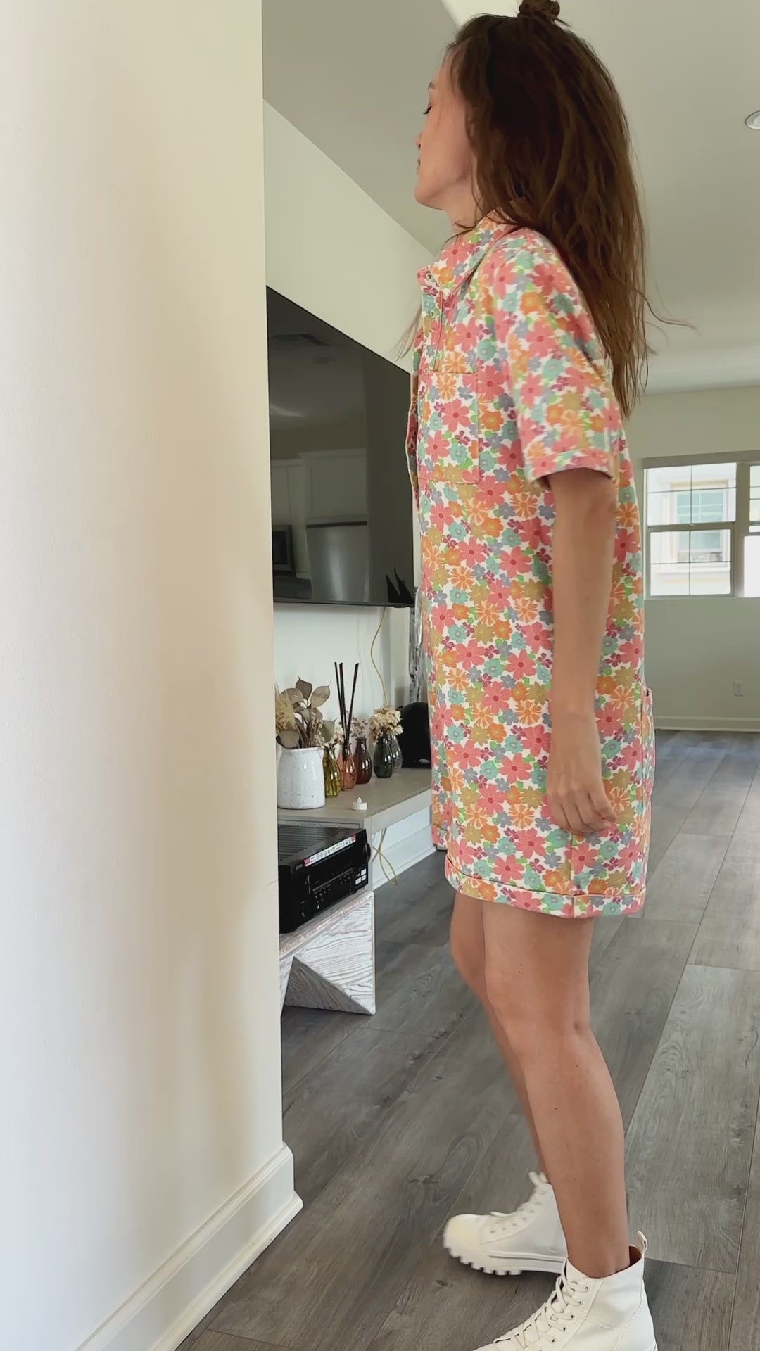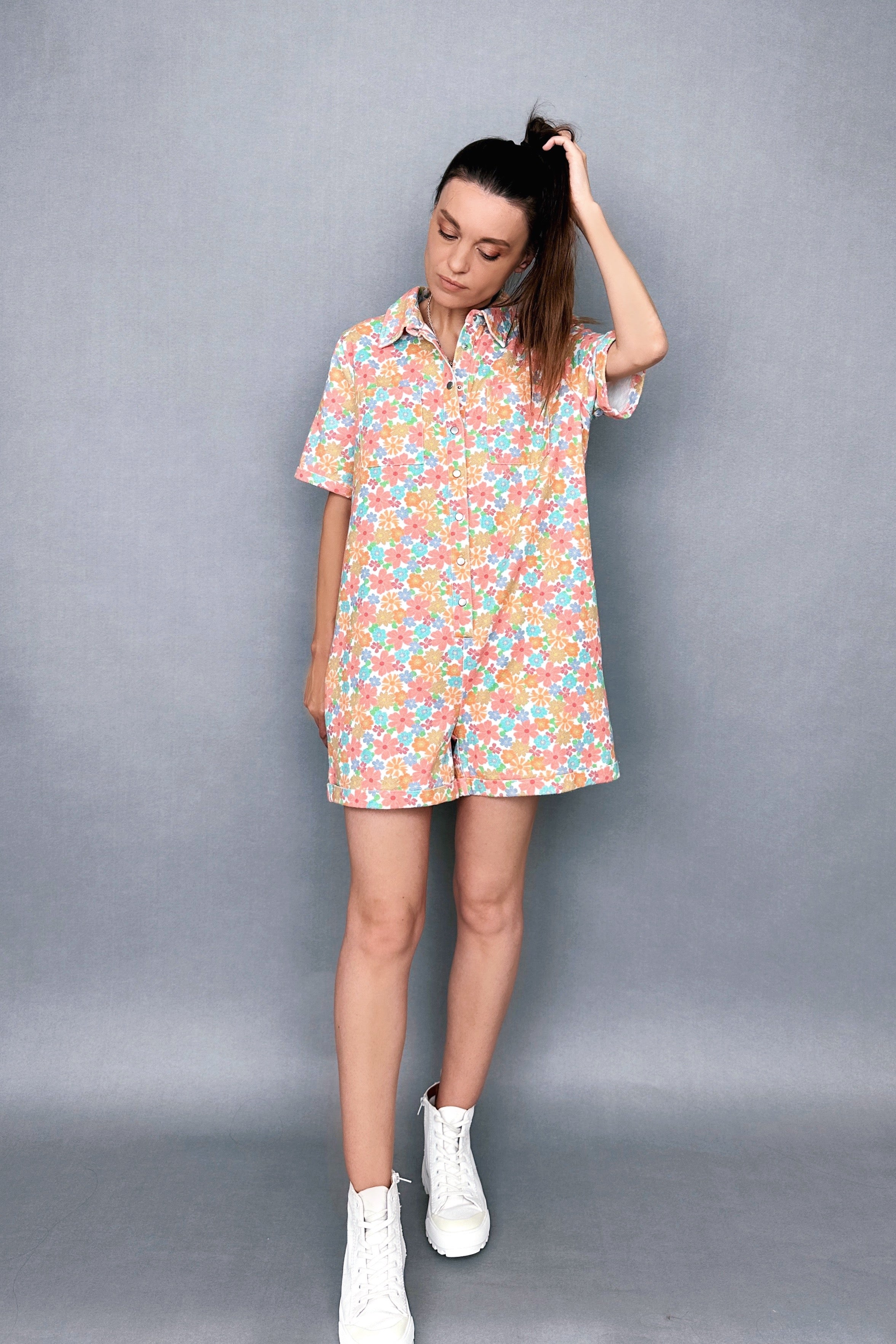 Multicolor floral denim romper. It exhibits a collar, short sleeves with rolled edges, and bust pockets. It has a center button-up, side pockets, yoke back, and back pockets.