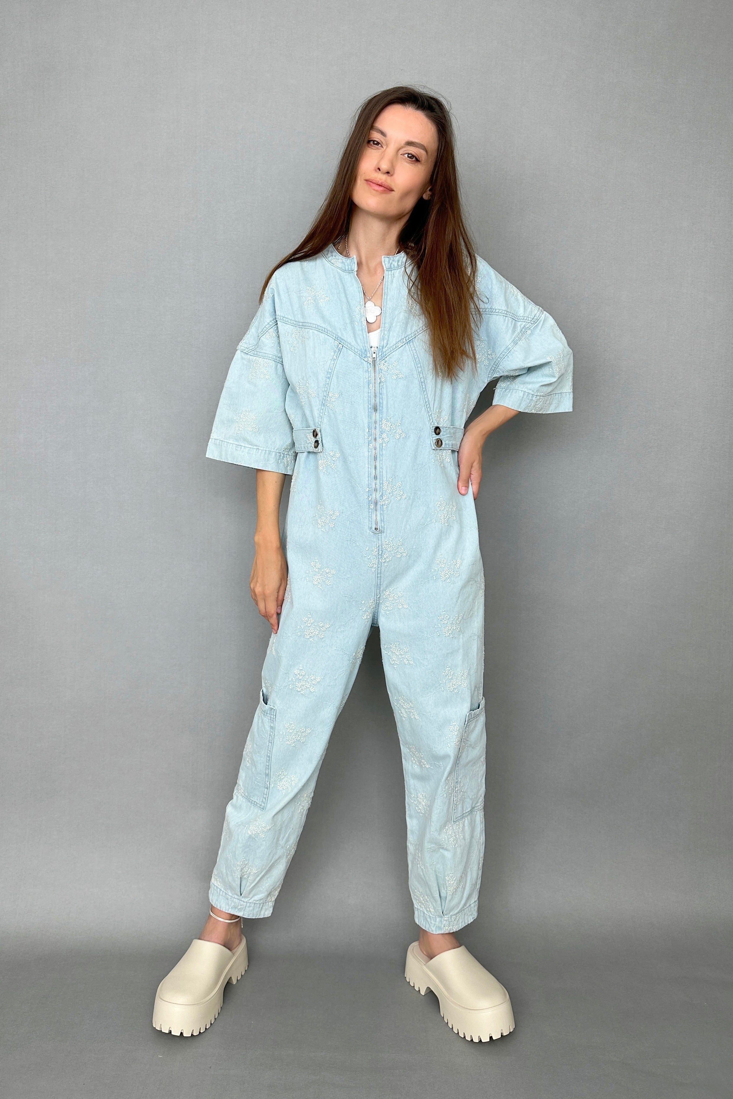 This stunning jumpsuit, made of denim and featuring beautiful embroidery, boasts a timeless silhouette that's bound to catch eyes whenever you wear it.