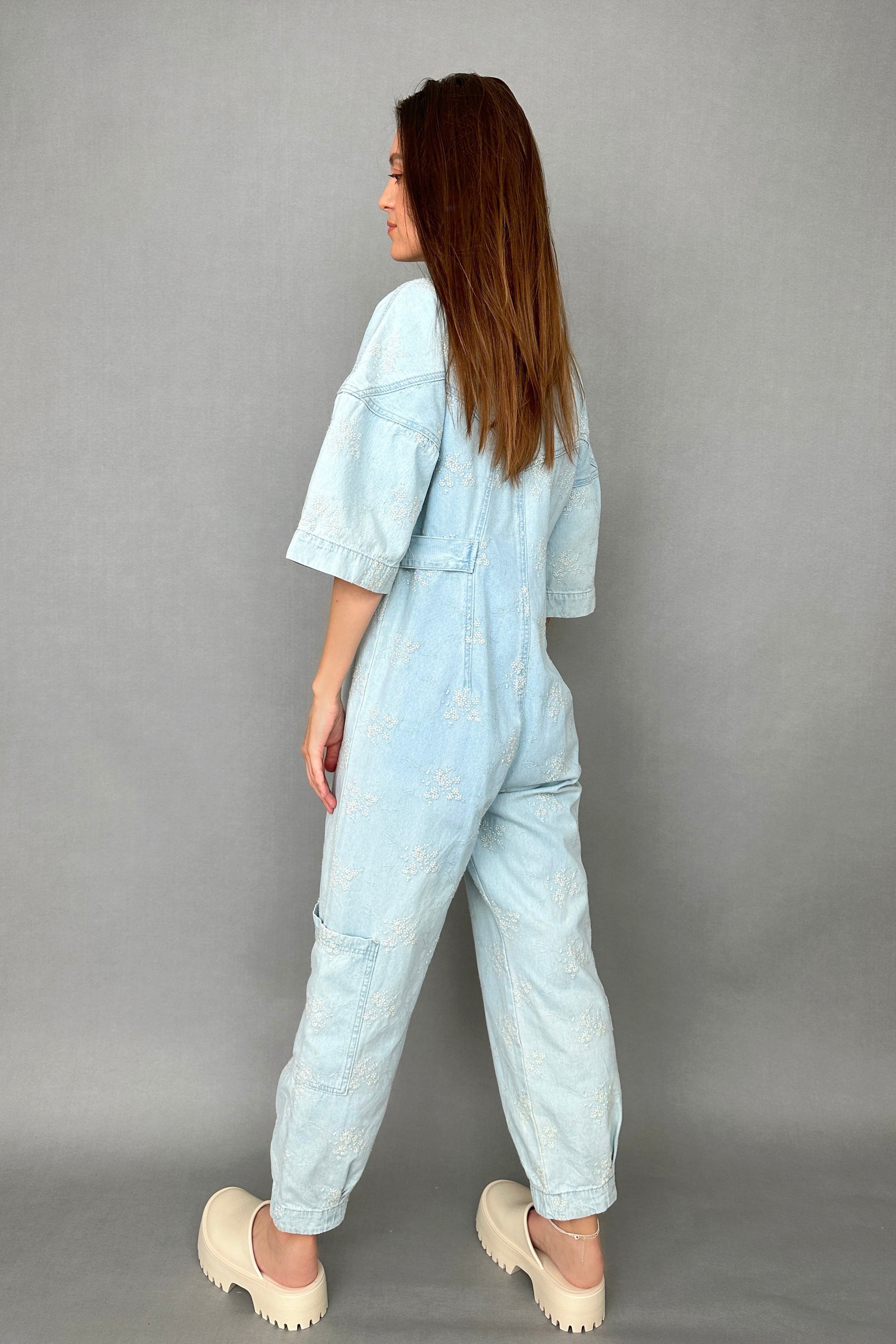 Embroidered Sakura Denim Jumpsuit - Blue - FINAL SALE