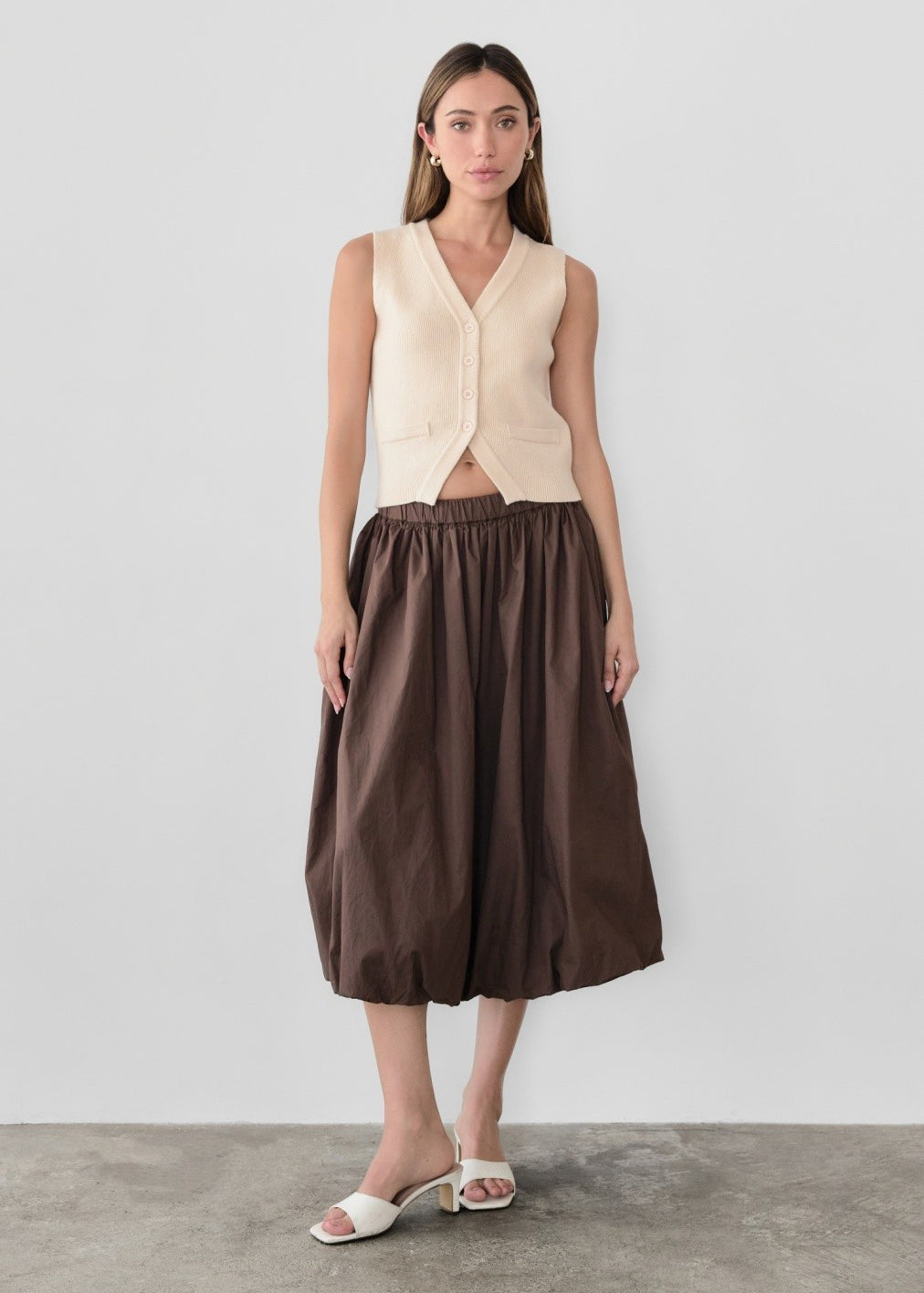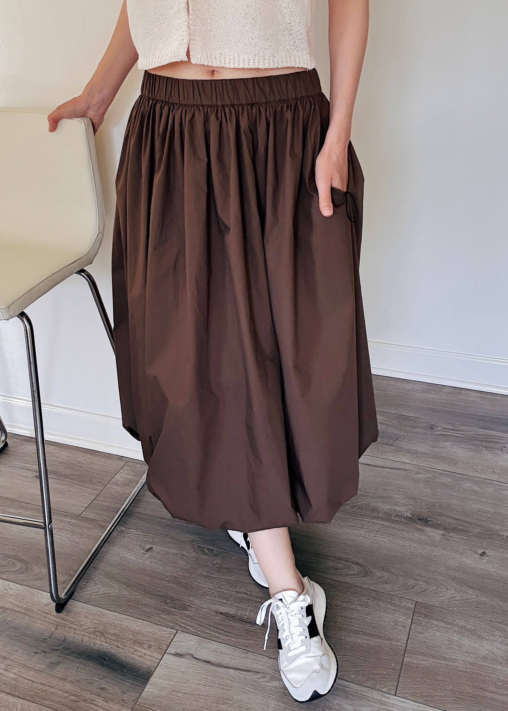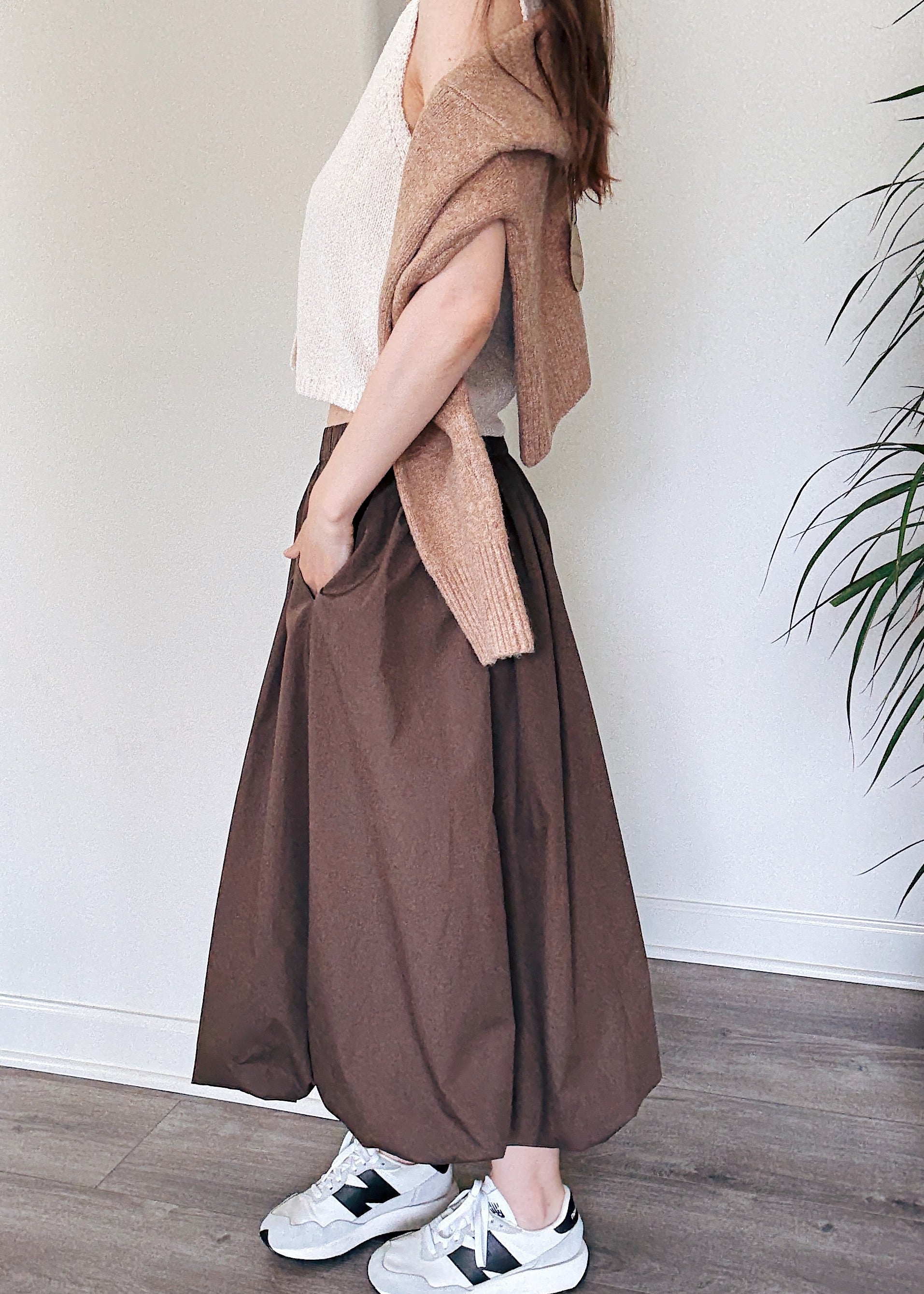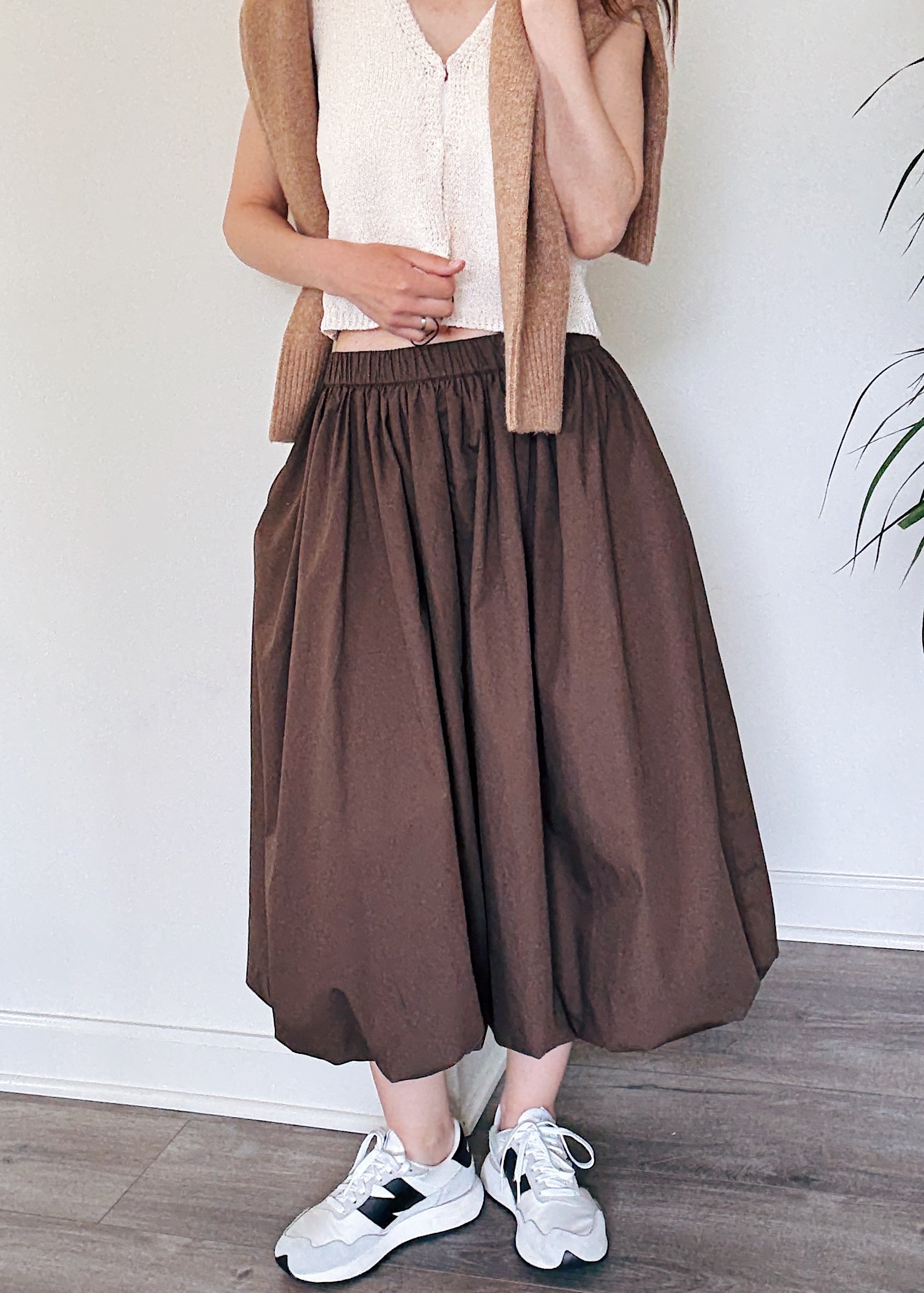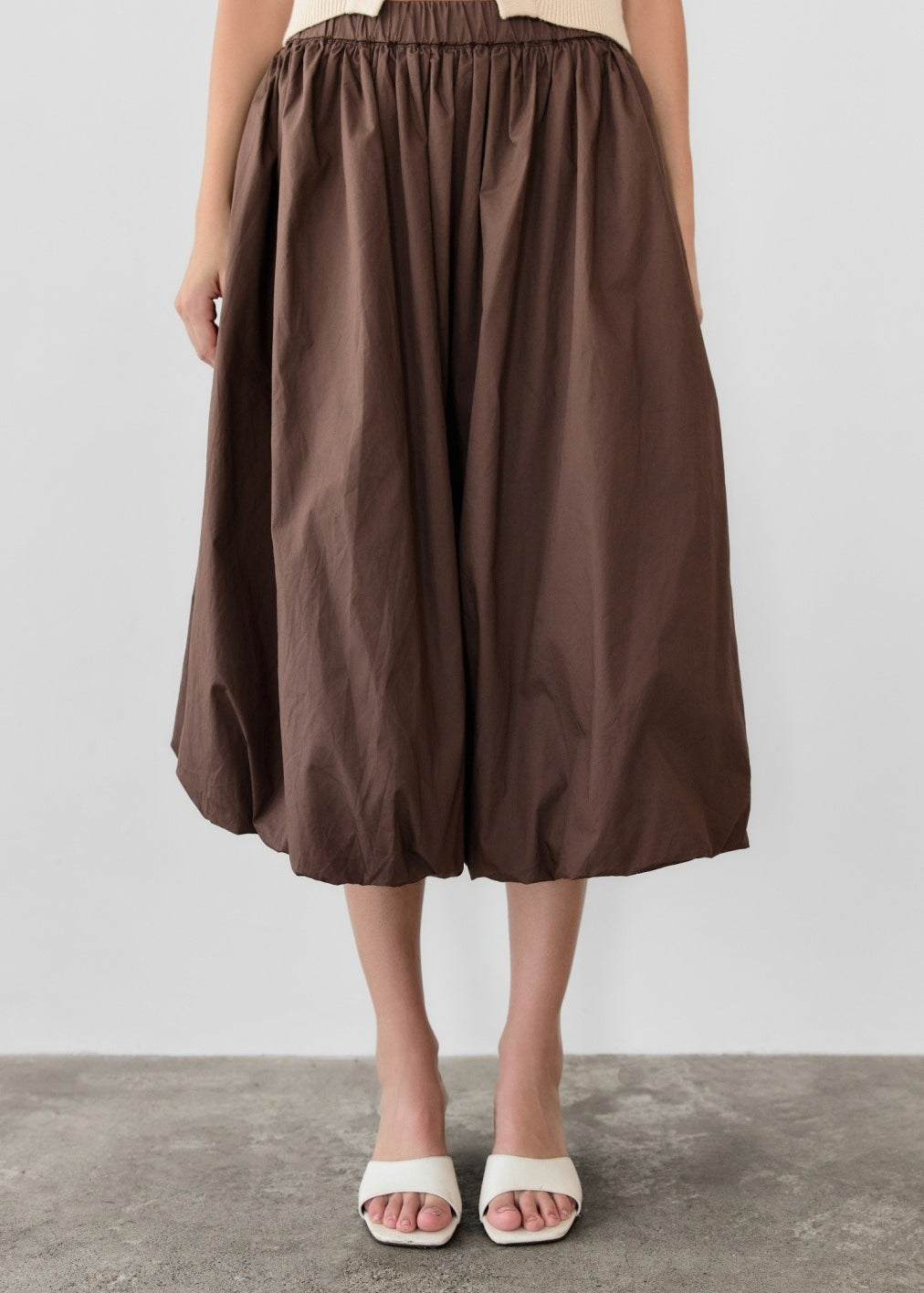 Cotton Poplin Bubble-Hem Midi Skirt- Brown