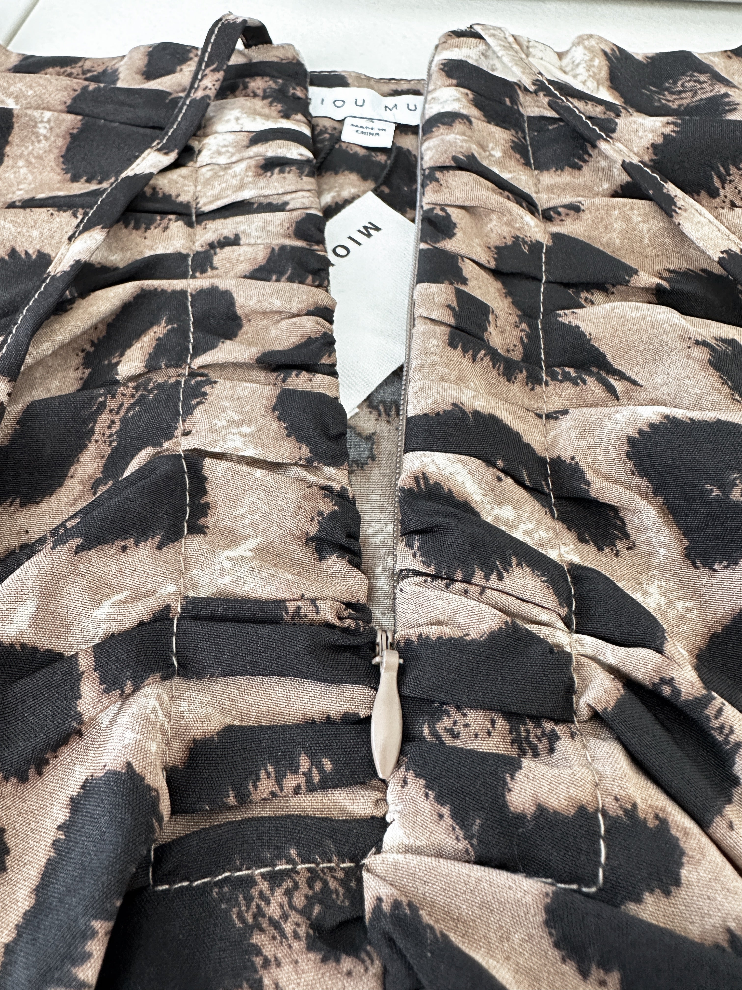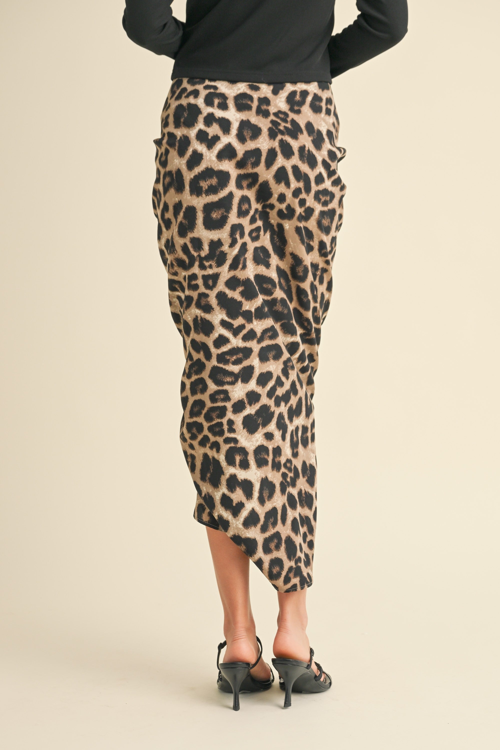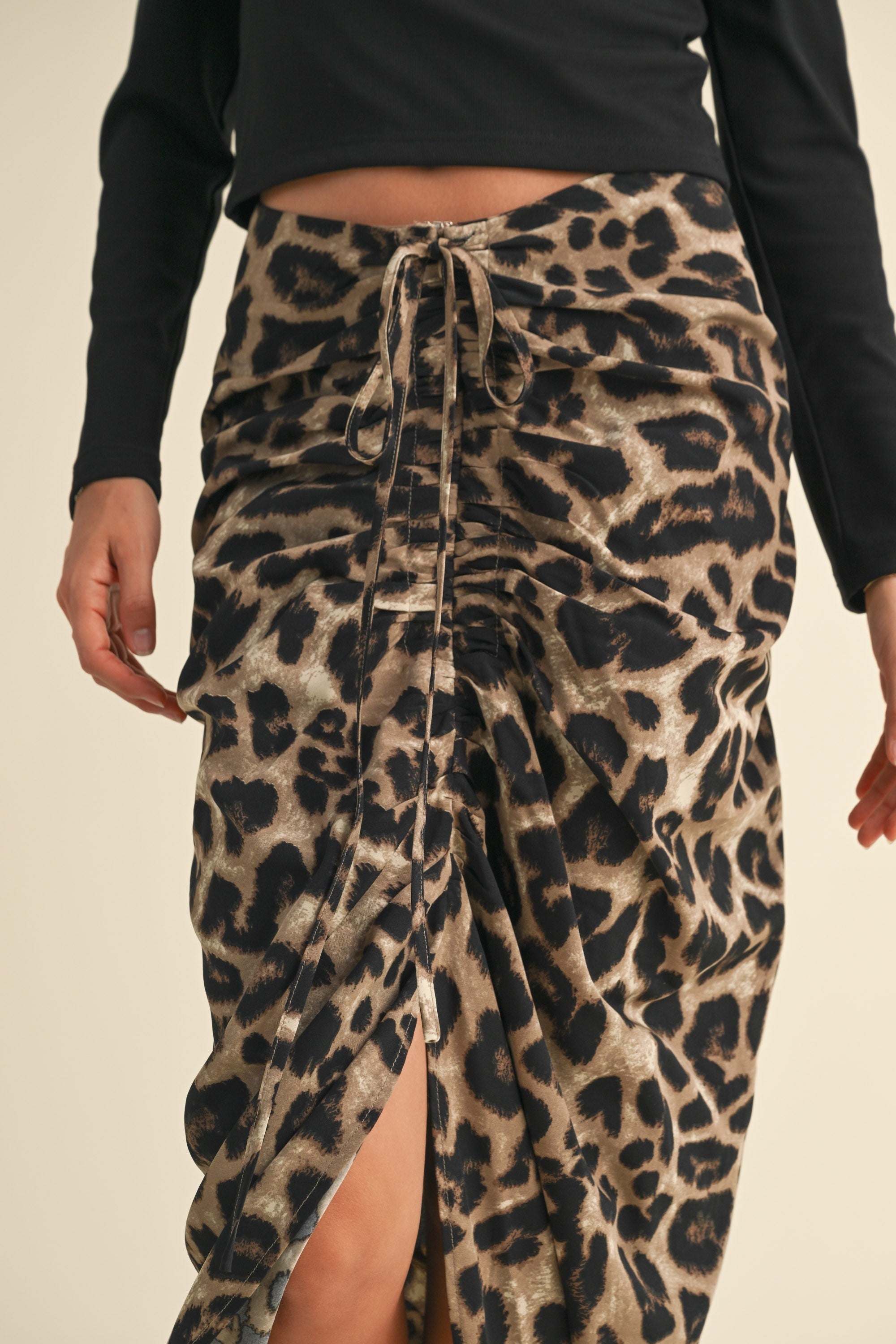 Unleash your inner wild side with this fierce leopard print midi skirt. The ruched detailing and front zipper add a bold, edgy touch to any outfit.