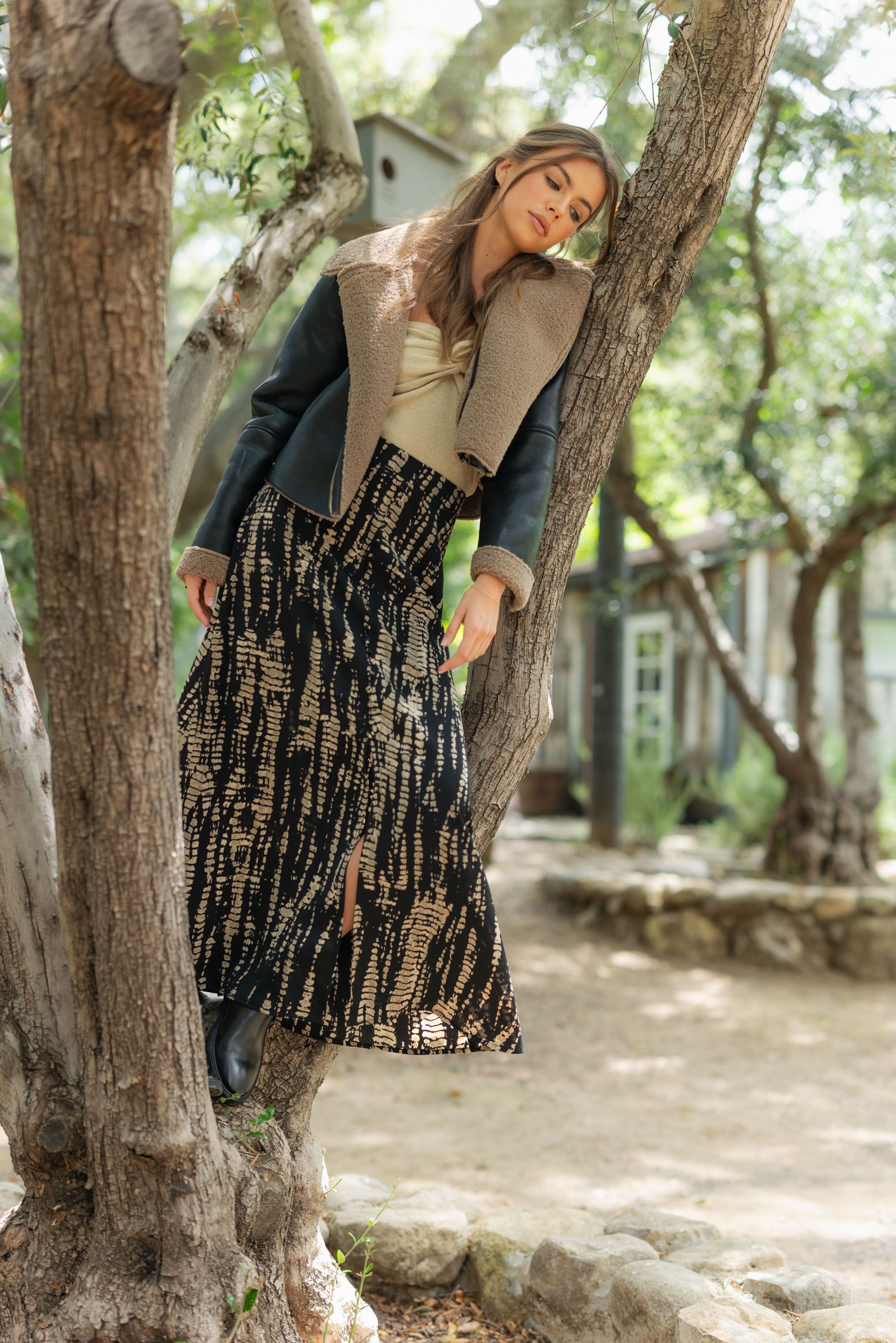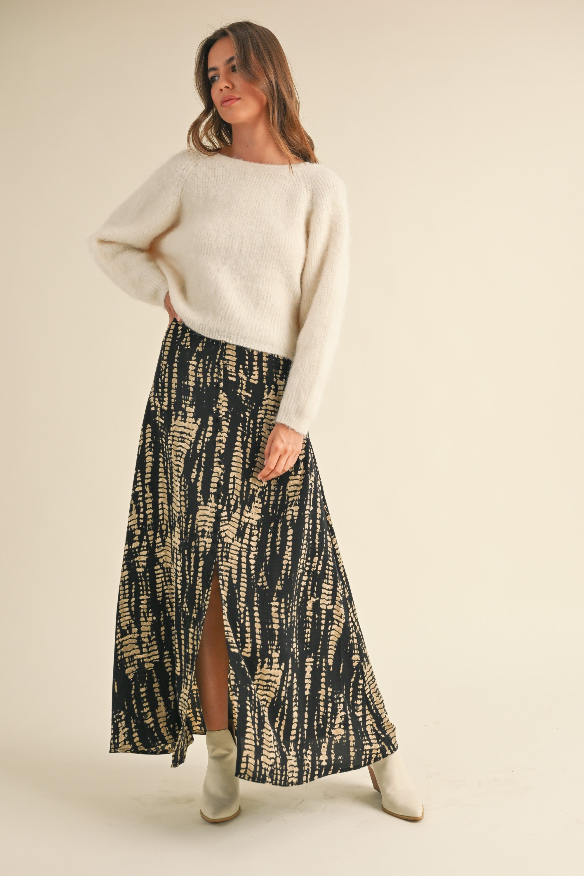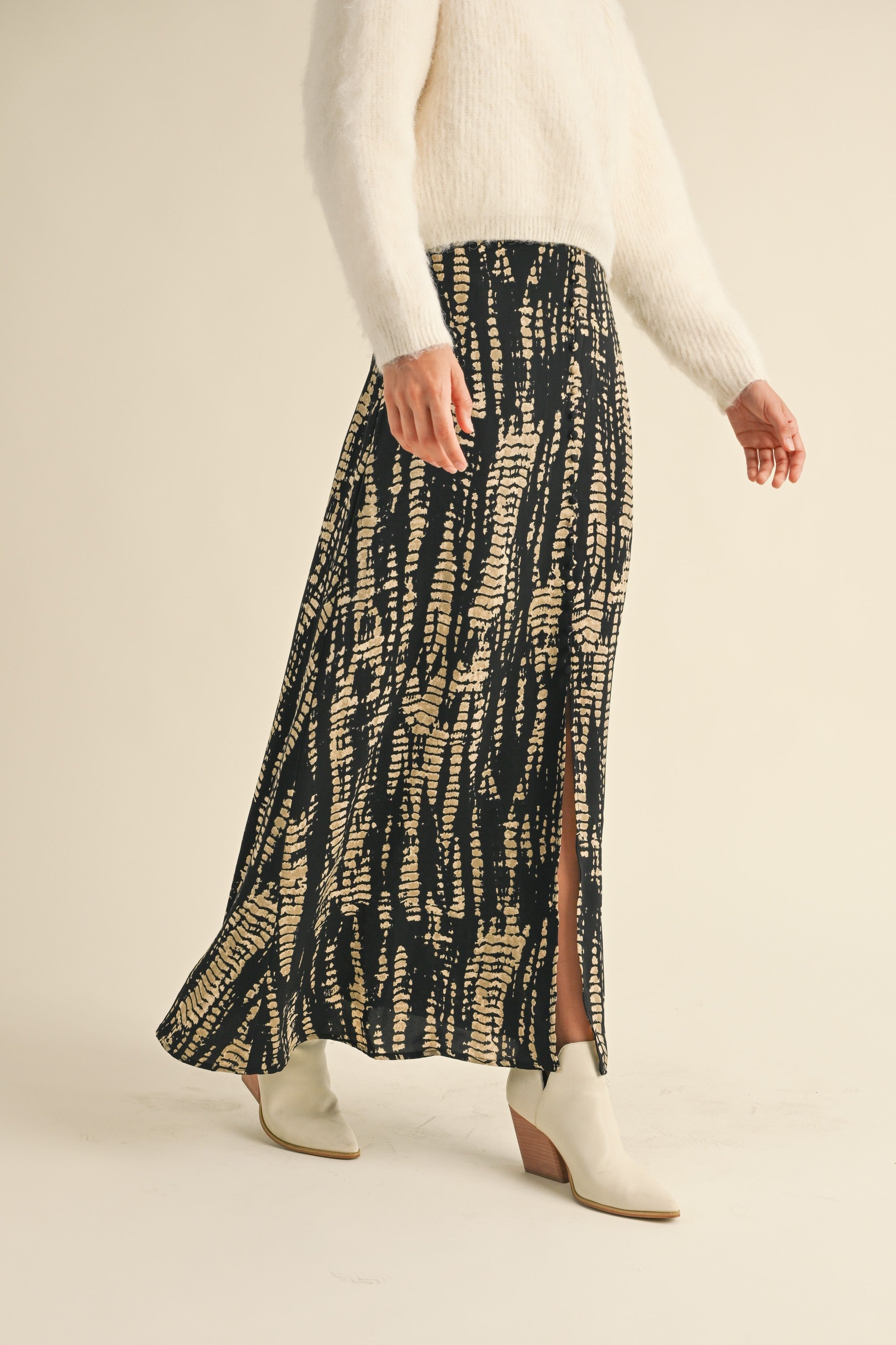 The Desert Shadow Slit Skirt offers sleek style with its bold black and tan pattern and eye-catching front slit. Perfect for any occasion.