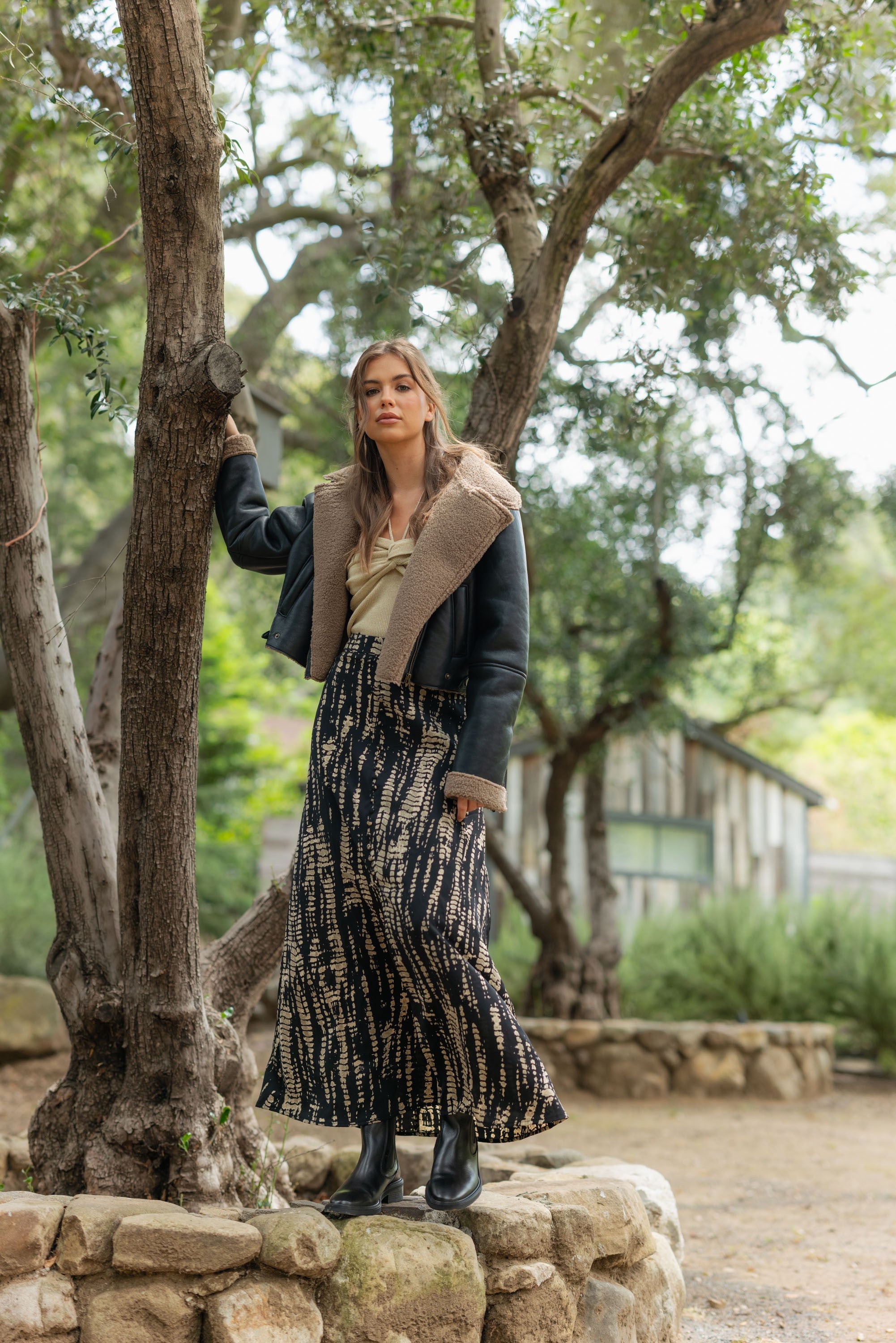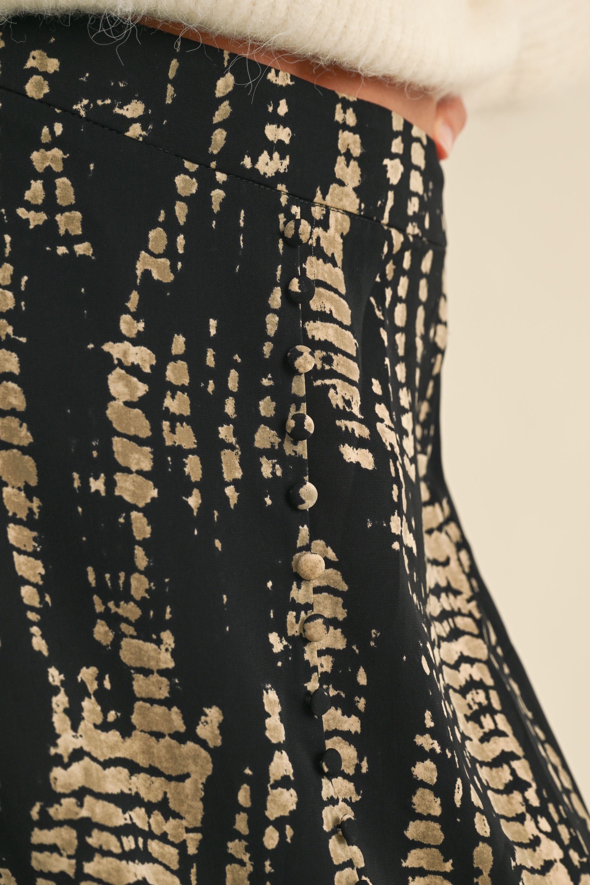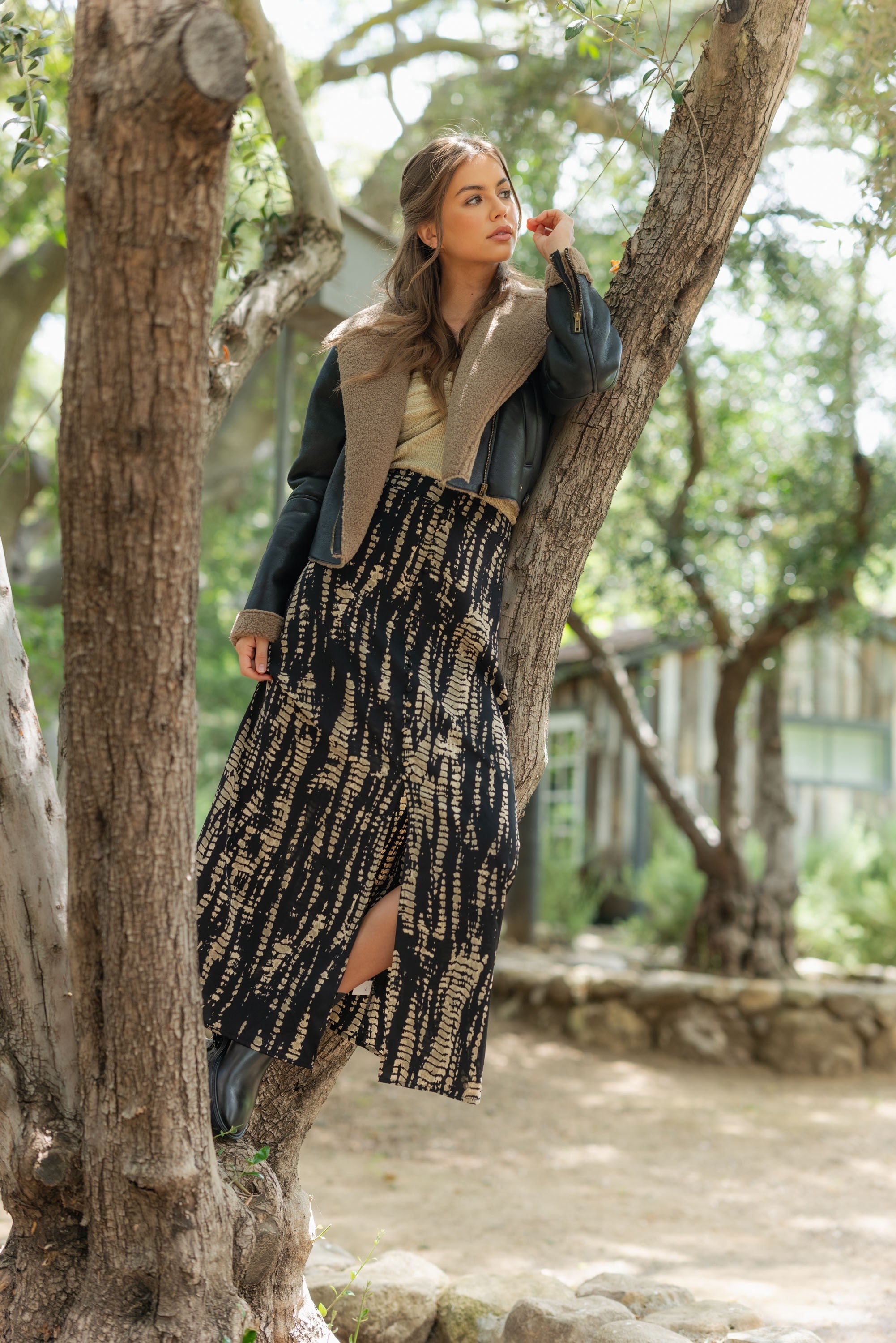 The Desert Shadow Slit Skirt offers sleek style with its bold black and tan pattern and eye-catching front slit. Perfect for any occasion.