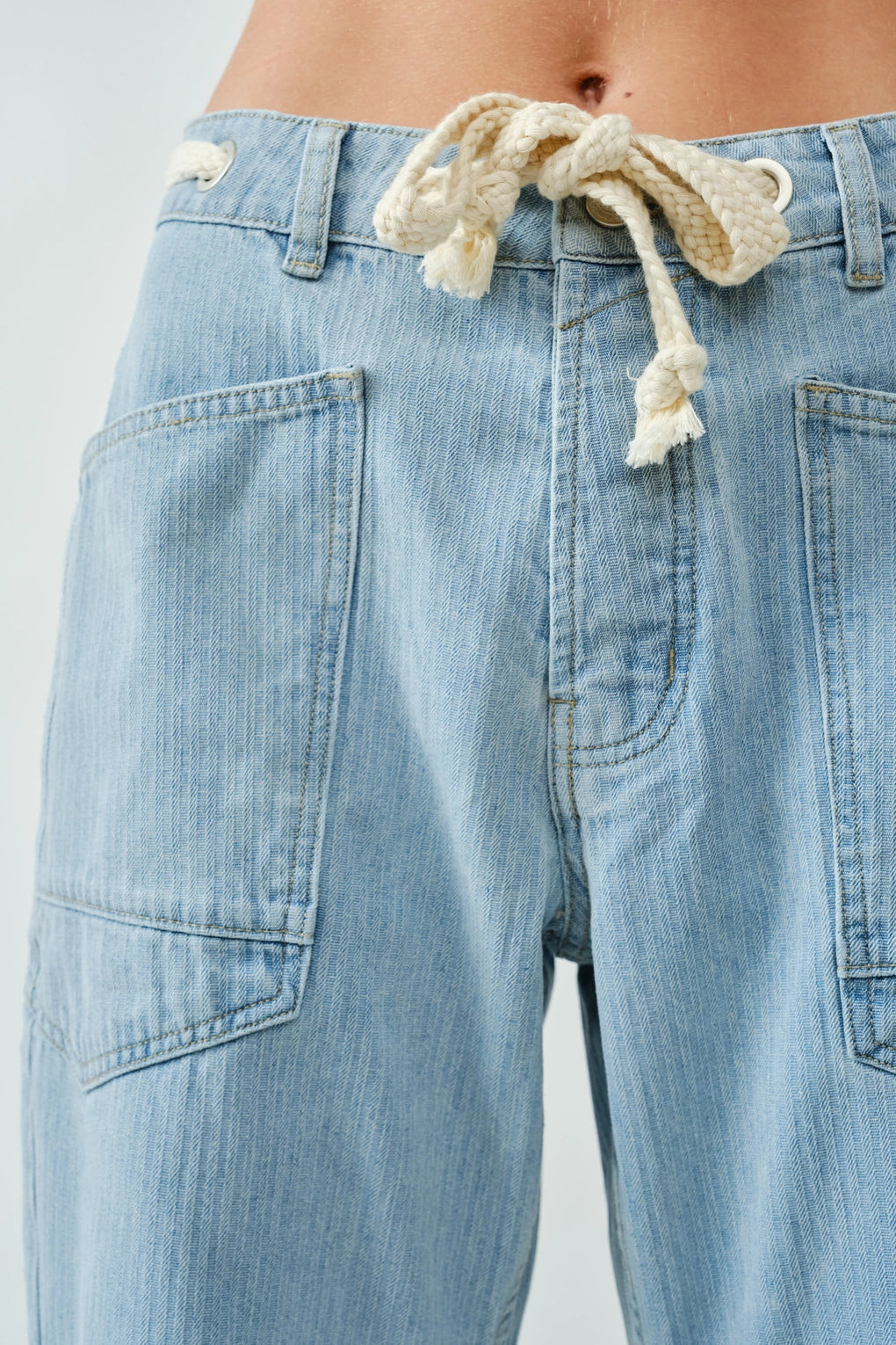 Designed with eyelet detailing at the waist and adjustable corded drawstrings, these cropped barrel jeans balance structure and softness. The curved leg shape creates a contemporary silhouette, while the breathable cotton-blend fabric offers comfort with a touch of durability.