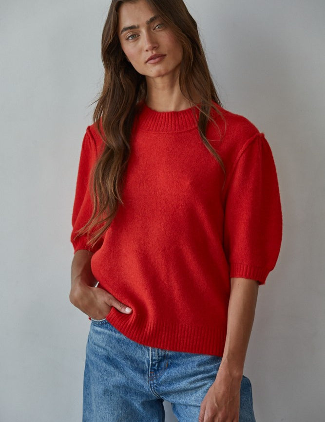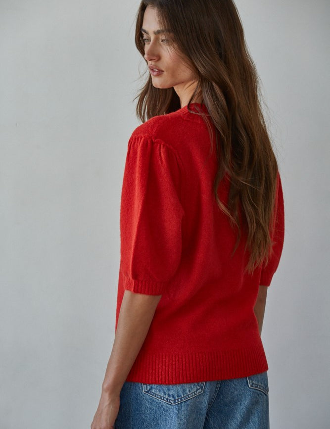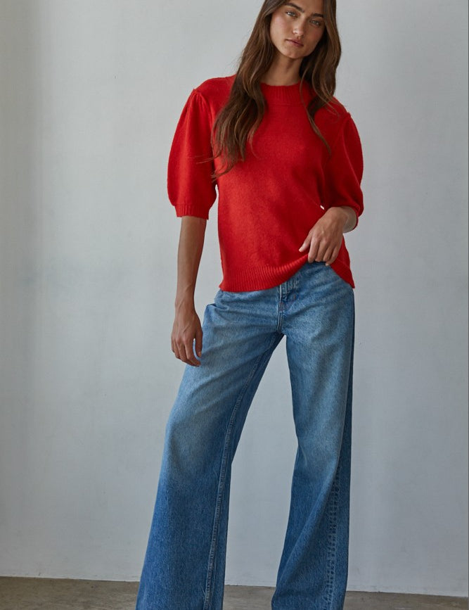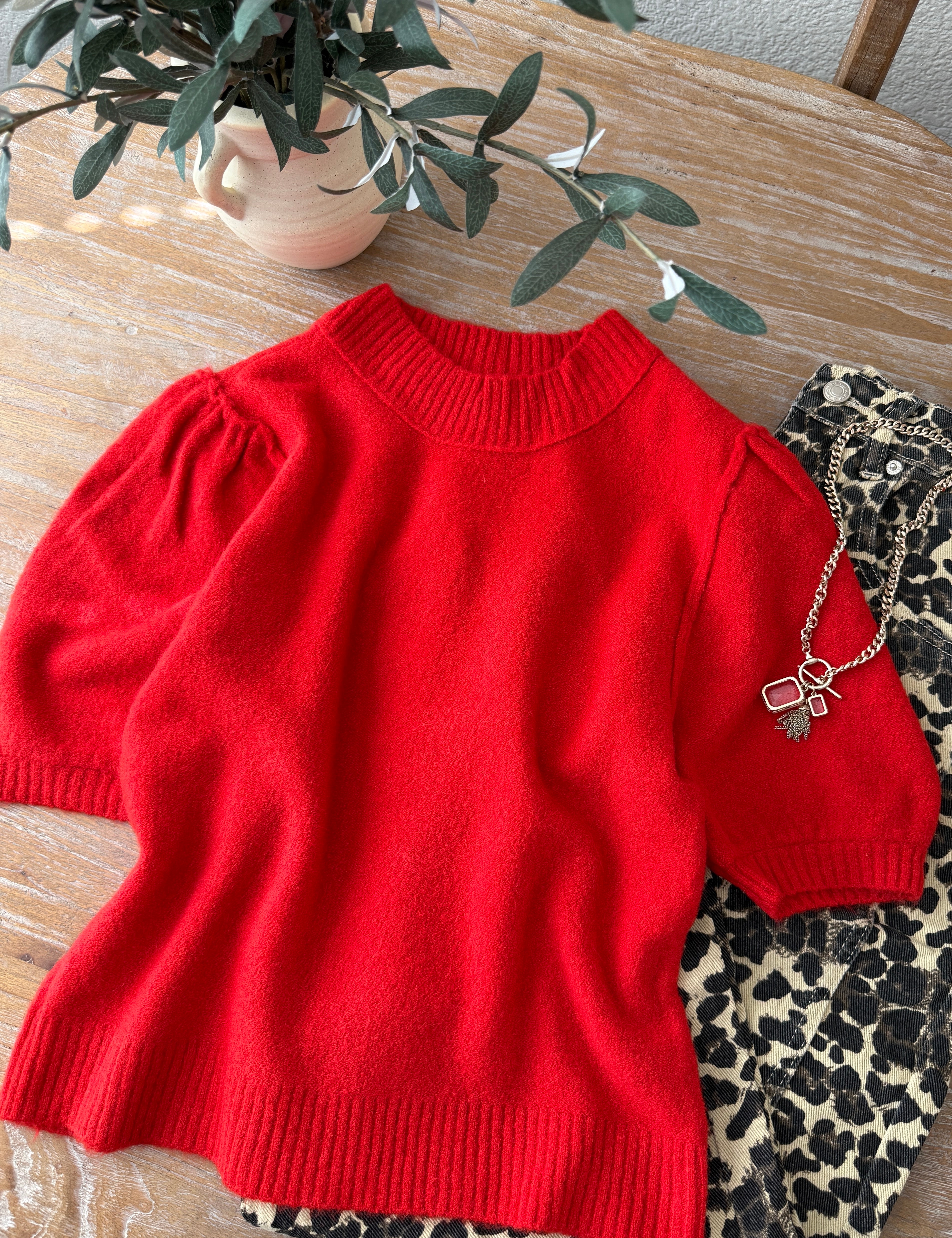 Soft Balloon Sleeve Short Sleeve Sweater - Red