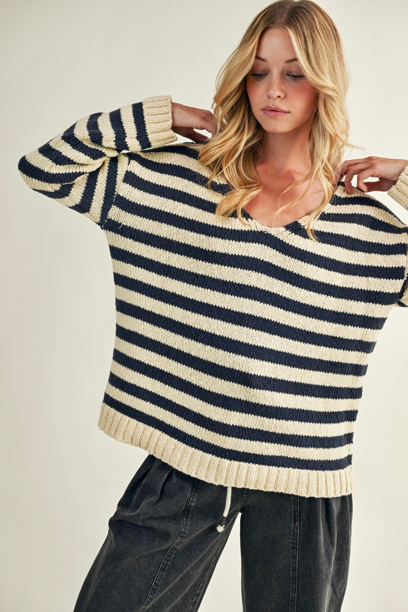 Cozy Stripe V Neck Pullover - Navy/Ivory