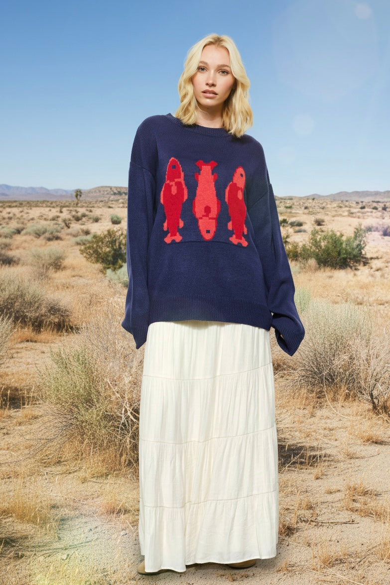 Woman wearing the Marina Fish Knit Sweater in navy — chunky oversized knit with bold red fish embroidering.