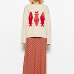 Woman wearing the Marina Fish Knit Sweater in sand — chunky oversized knit with playful red fish sardine motif