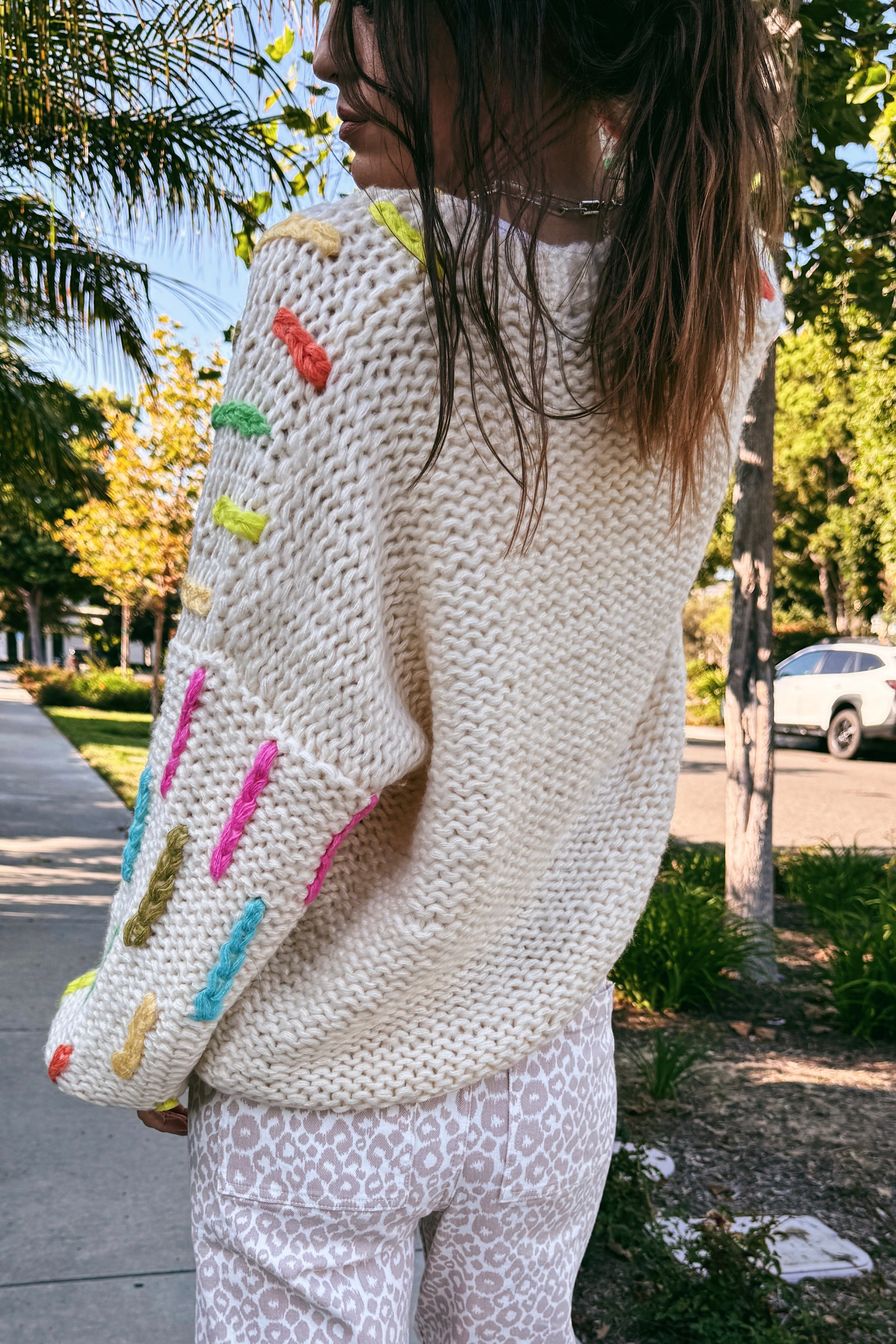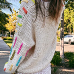 This Chunky Knit Cardigan features a playful design with colorful woven stitches on a cozy cream base. Perfect for adding a touch of whimsy to your outfit, it offers both warmth and a unique, vibrant look