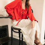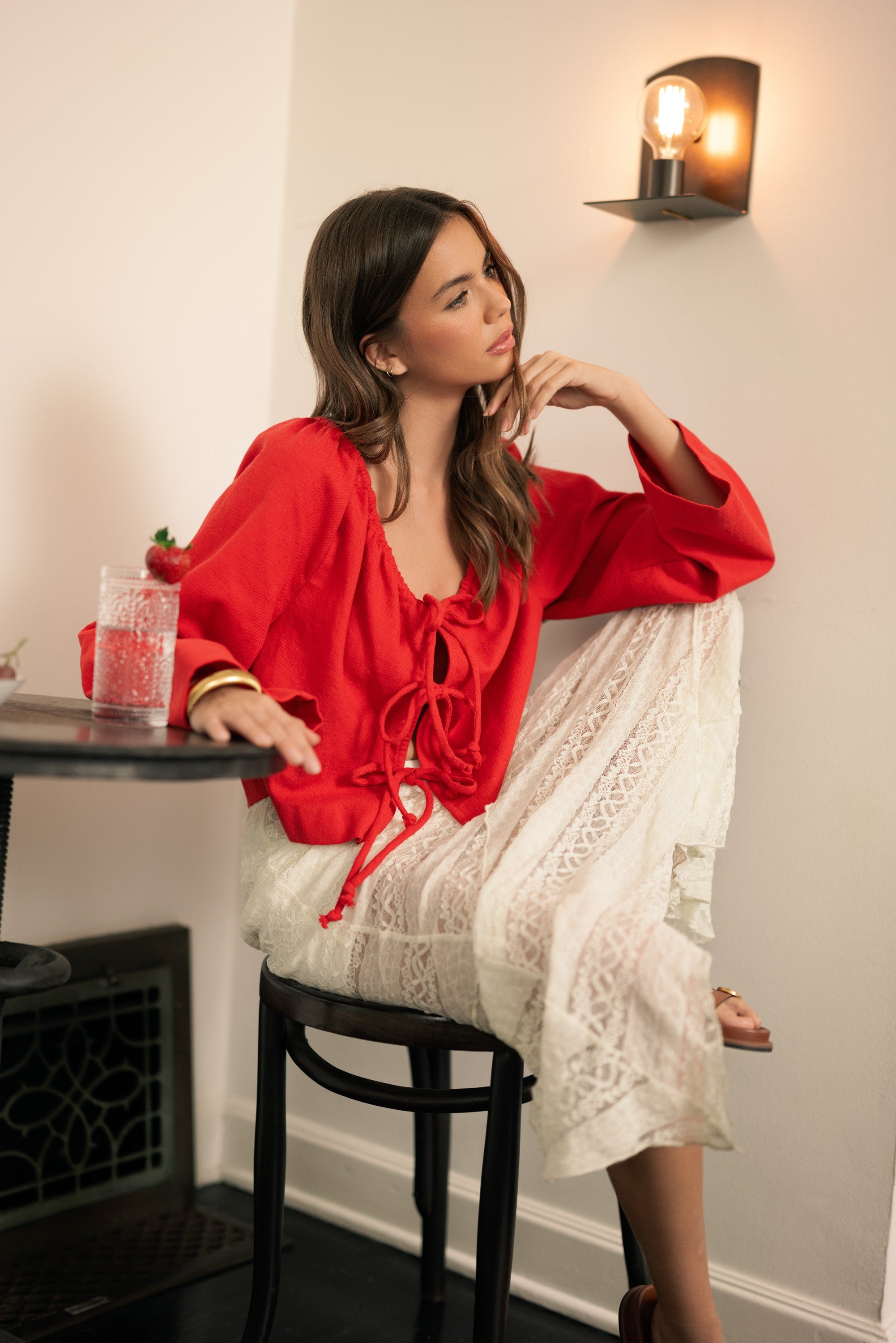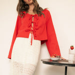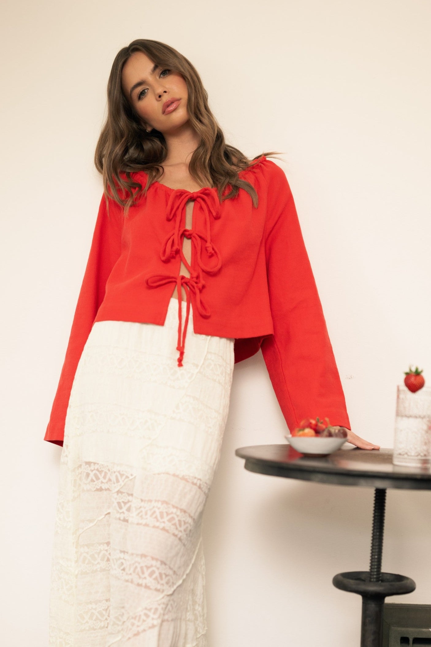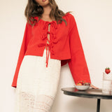 Chic and versatile, this relaxed-fit cardigan features a tie front with charming bow details, perfect for effortless layering.