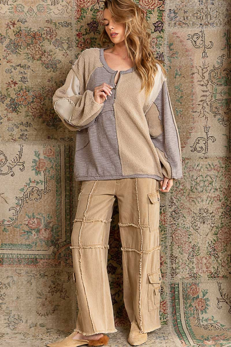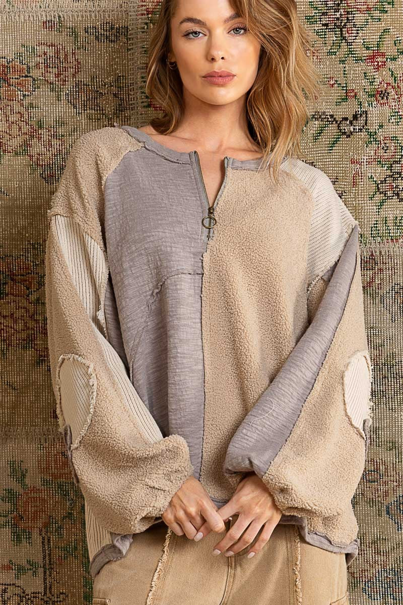 Introducing our comfy sweatshirt! It has a round neckline with a half zipper, puffy balloon sleeves, cozy contrasting fleece lining, an open front pouch pocket, and an oversized fit with cool raw edge details.