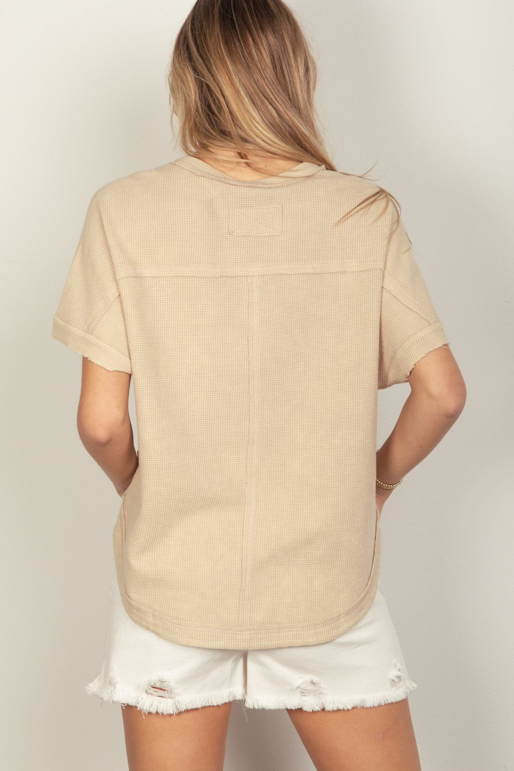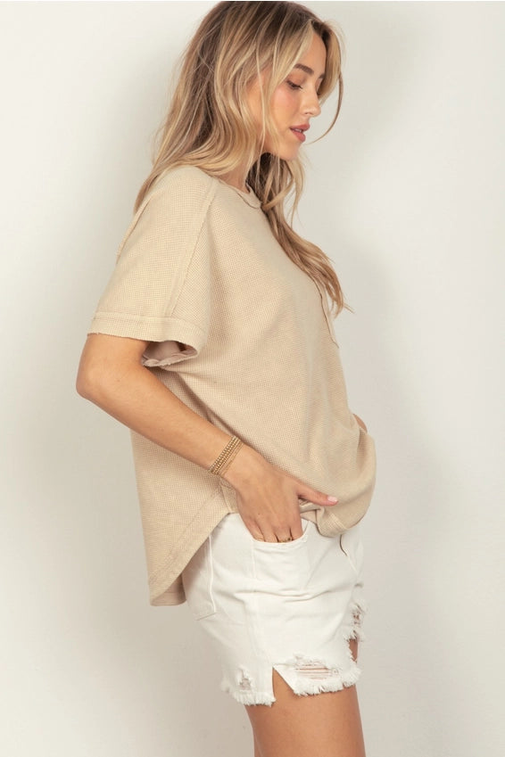 Dive into comfort with this waffle-knit tee! Oversized for a relax vibe, it rocks a laid-back round neck and cool exposed seems. Just right for those chill days.
