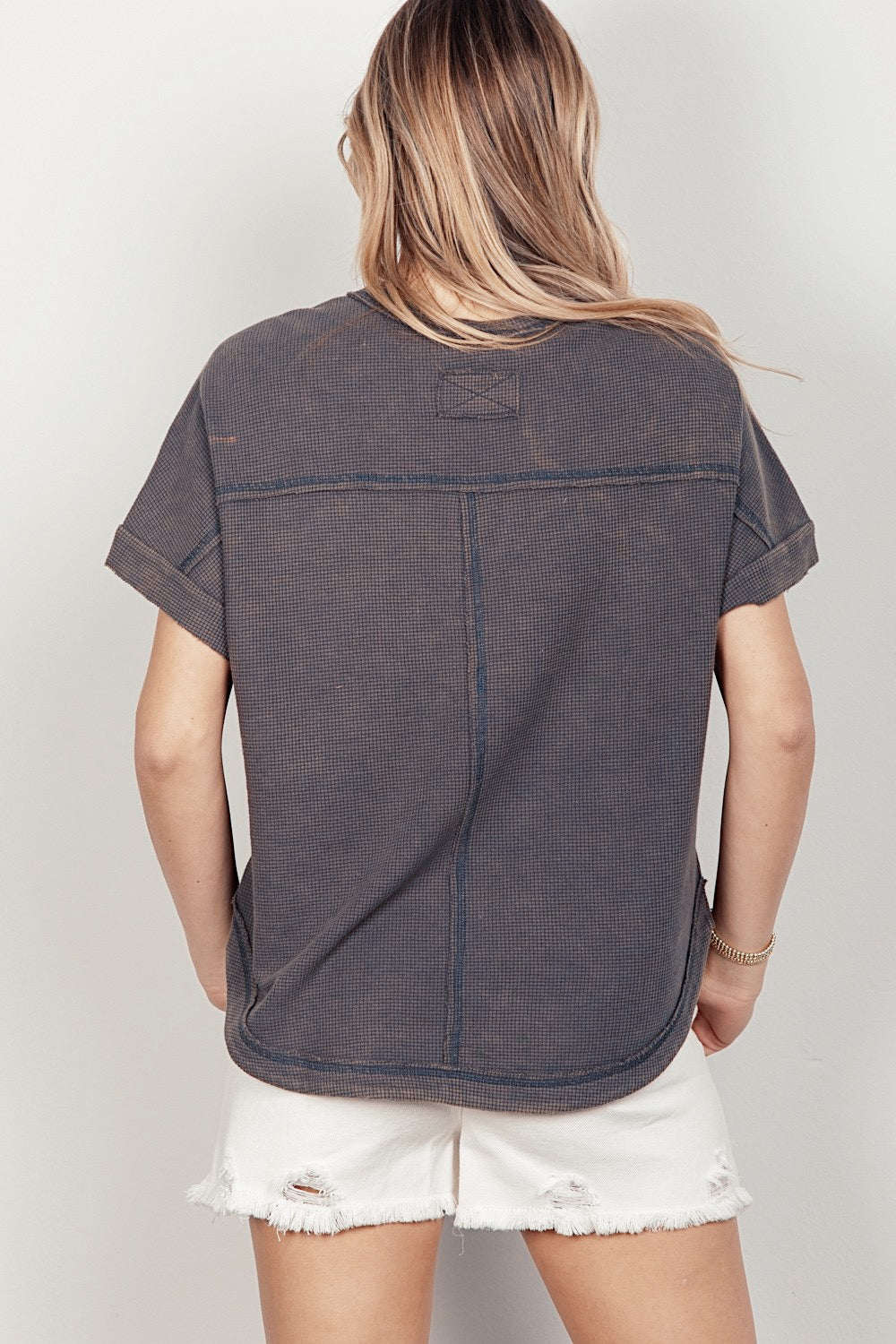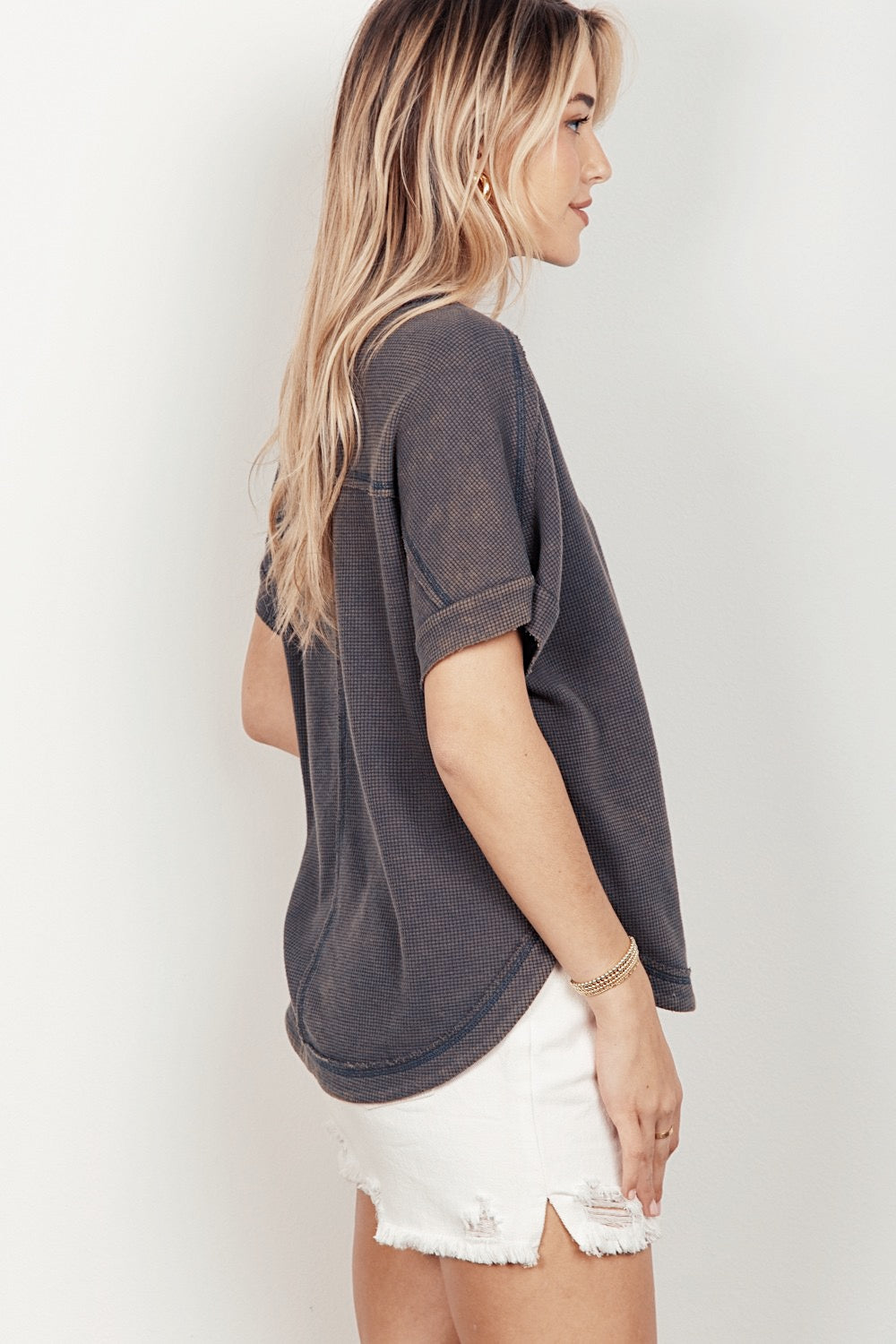 Dive into comfort with this waffle-knit tee! Oversized for a relax vibe, it rocks a laid-back round neck and cool exposed seems. Just right for those chill days.