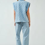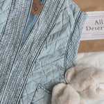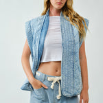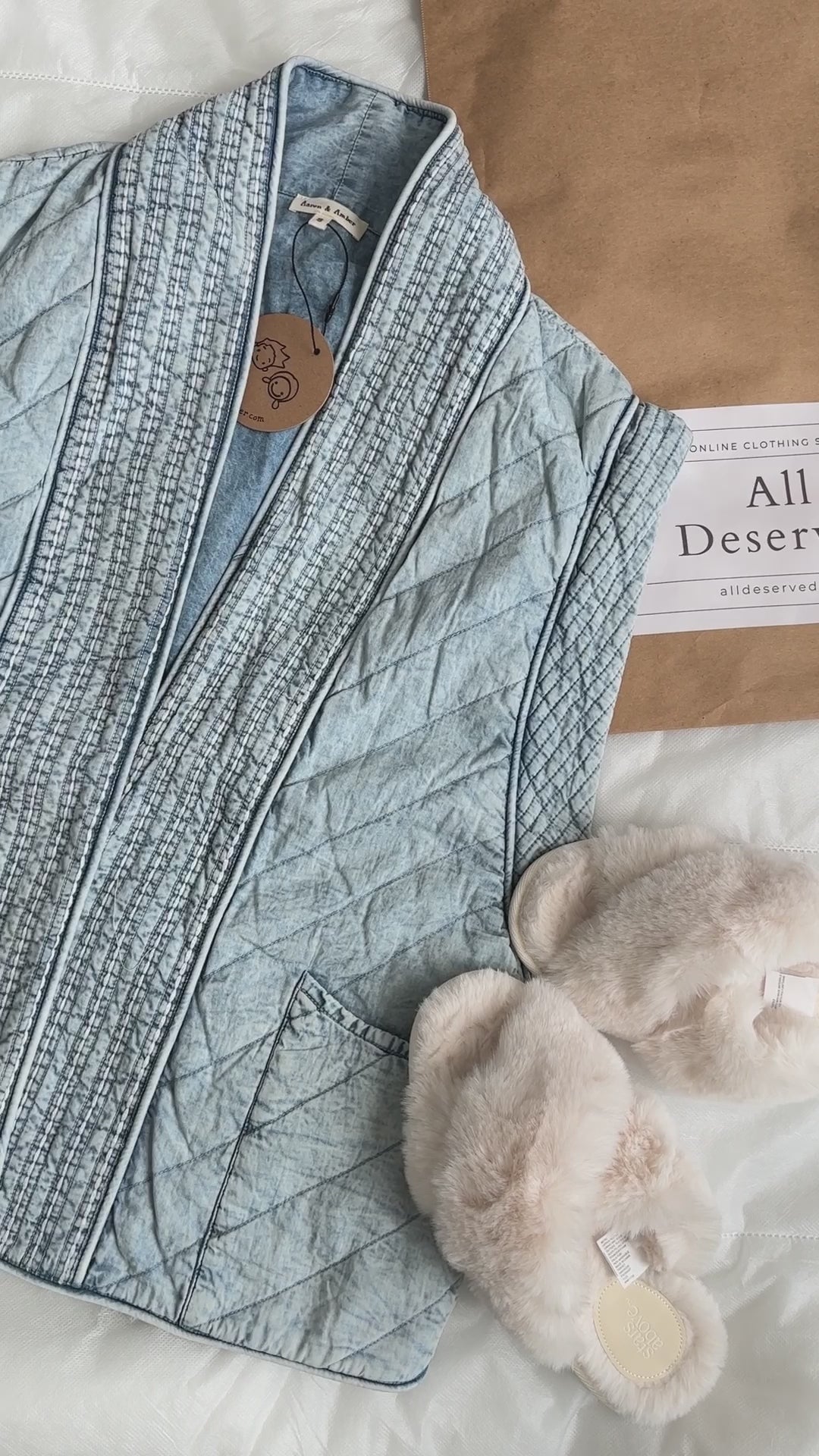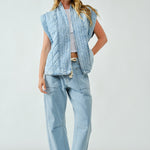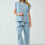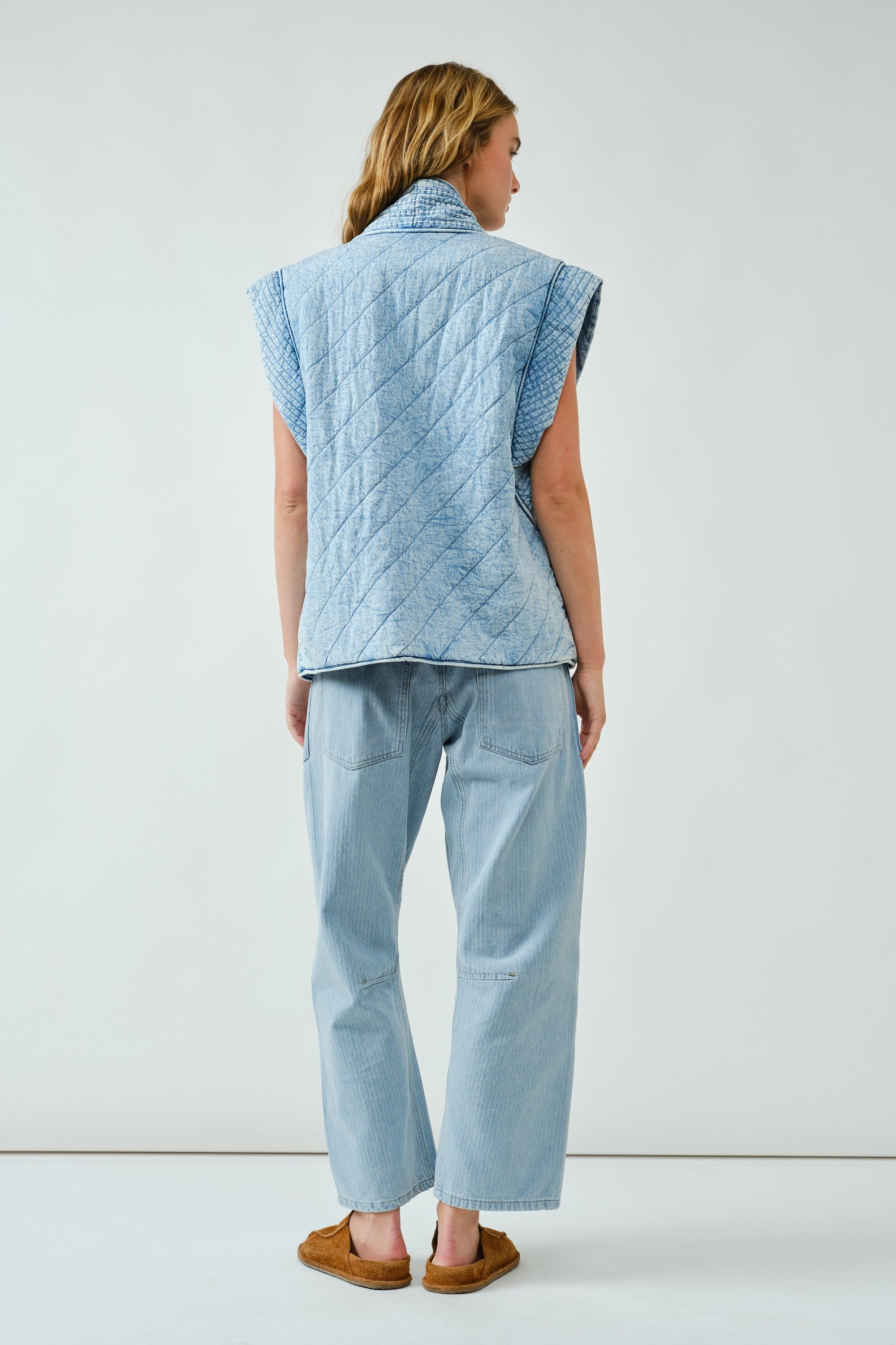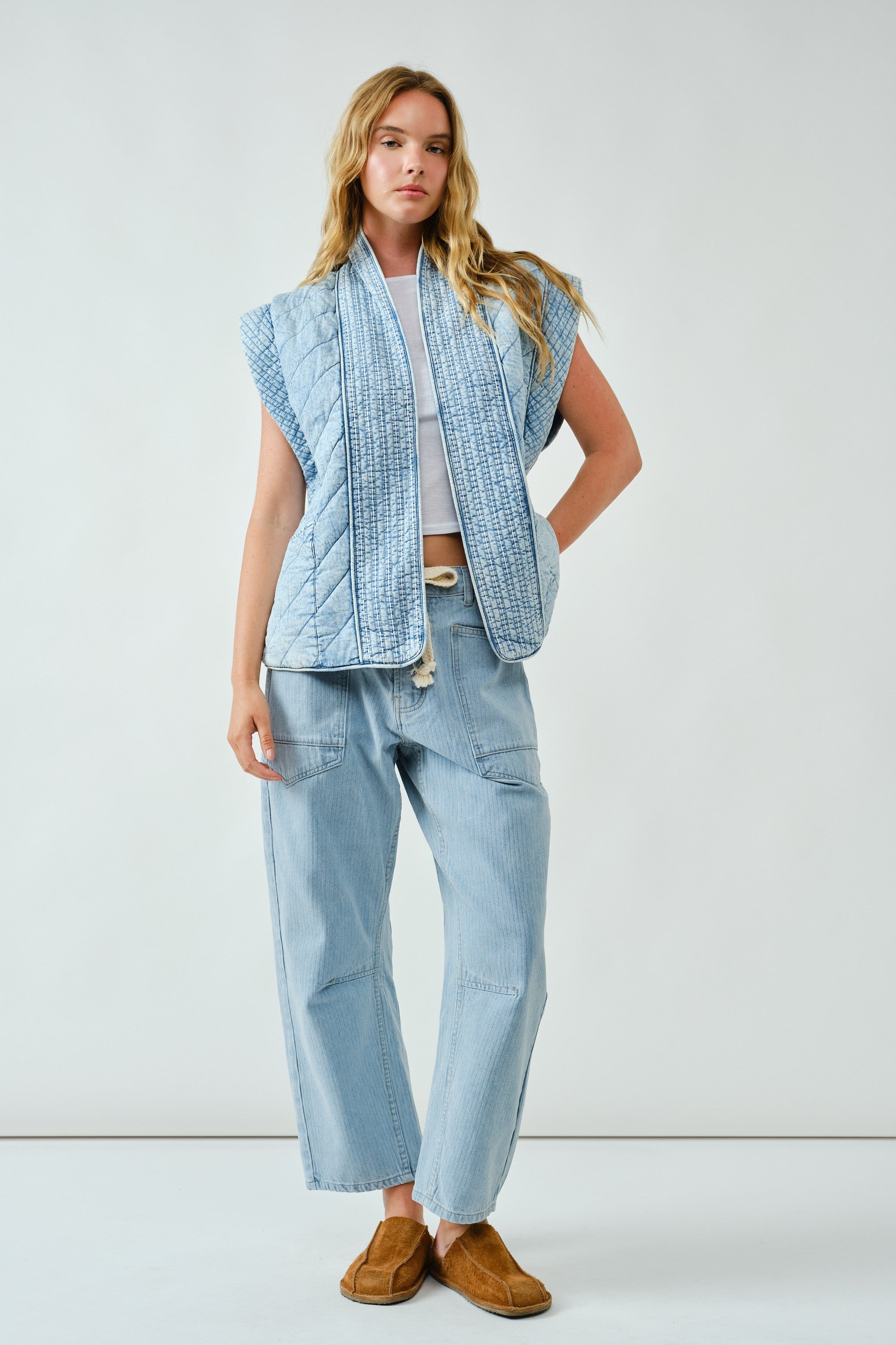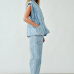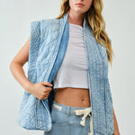 The Fuji Quilted Denim Vest brings casual comfort with a stylish edge, perfect for layering. Its oversized fit, quilted design, and embroidered trim add a unique touch to any look.
