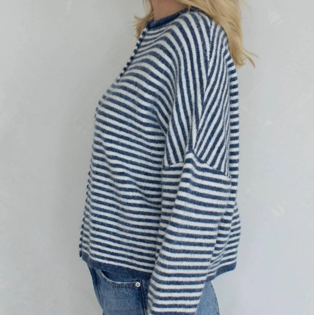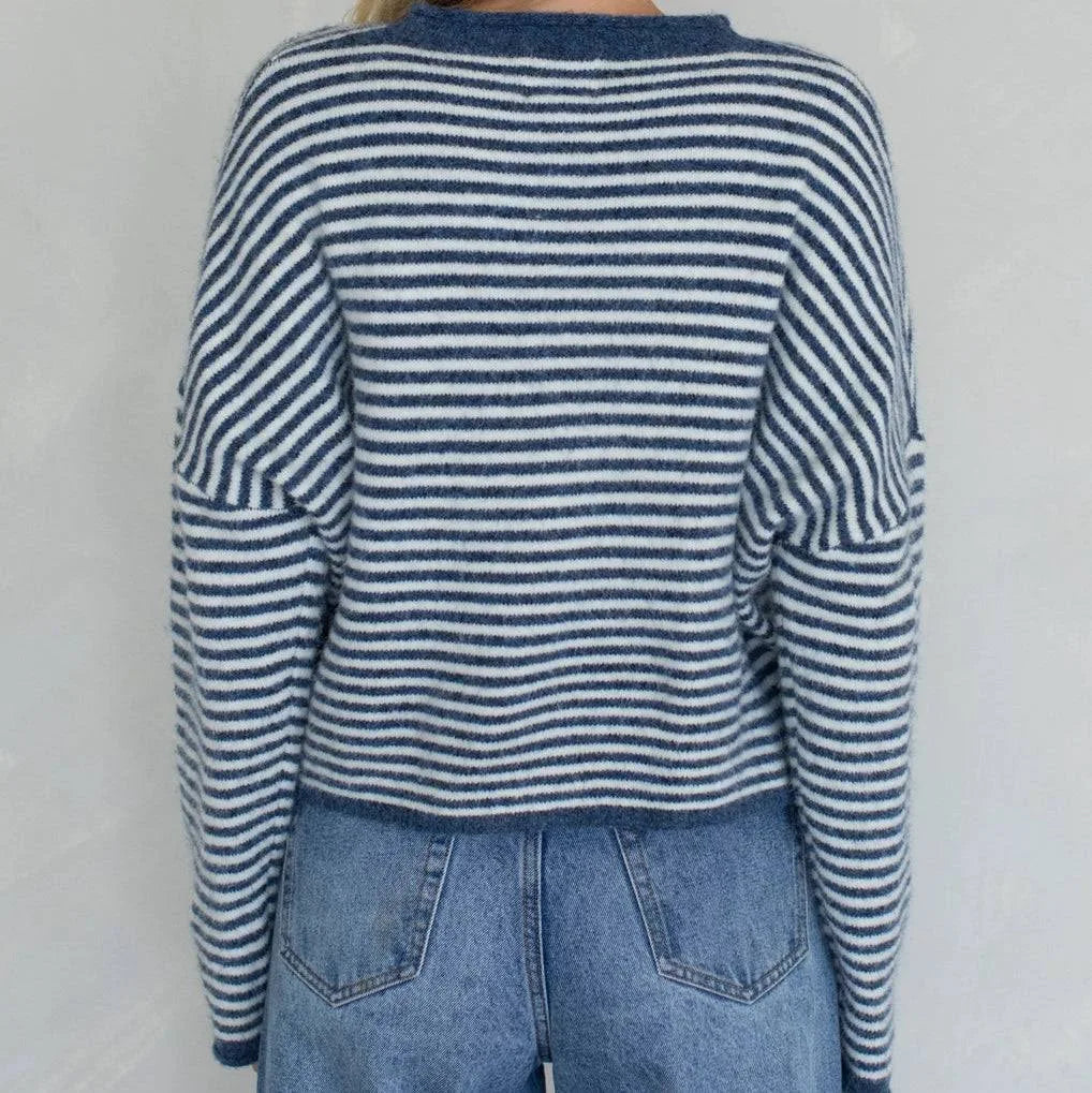 Crafted from a soft, lightweight knit with a subtle mini stripe pattern in denim tones, this cardigan blends comfort with understated sophistication. The classic button-front silhouette, round neckline, and relaxed rolled-edge finish create a timeless shape that feels polished yet easy.