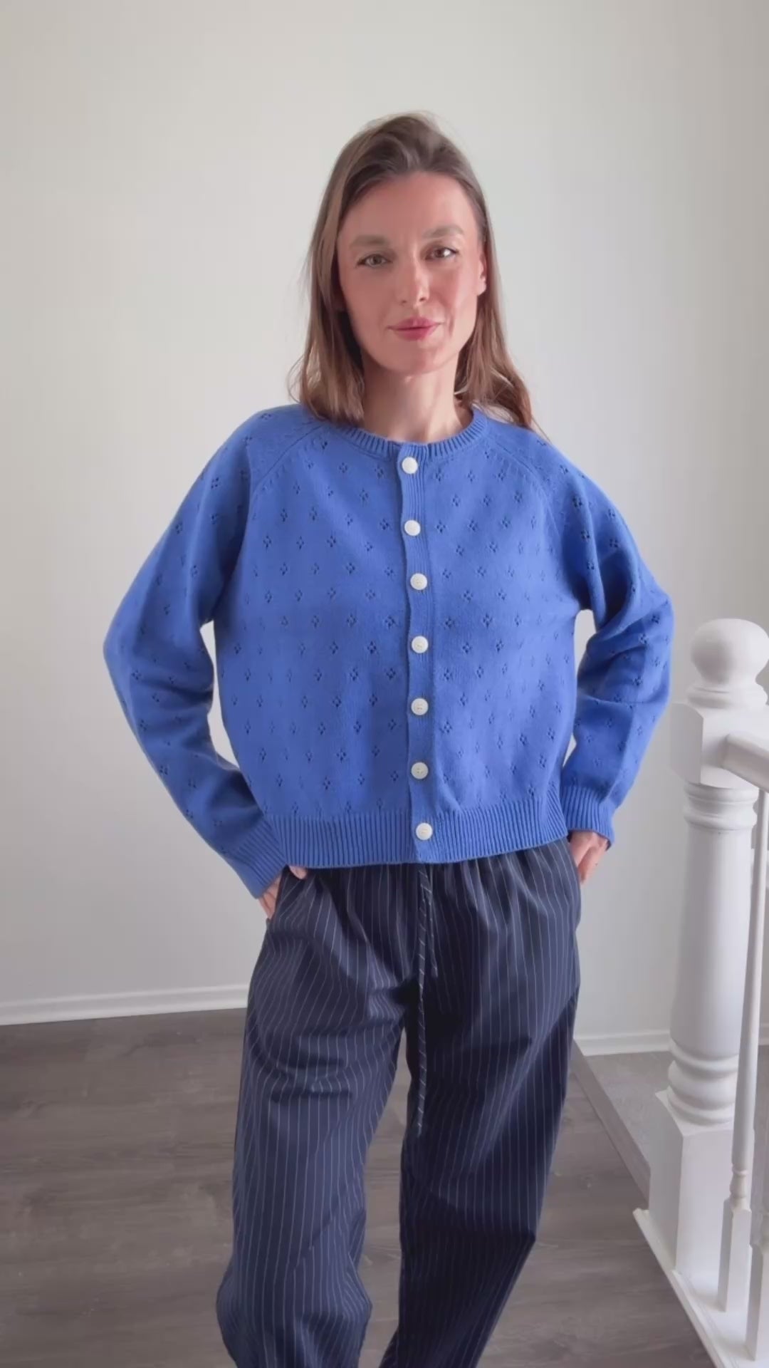 In a timeless navy pinstripe, these wide leg pants are an easy choice for everyday comfort. Made from 100% cotton, they feel lightweight, breathable, and soft, making them perfect for all-day wear.
