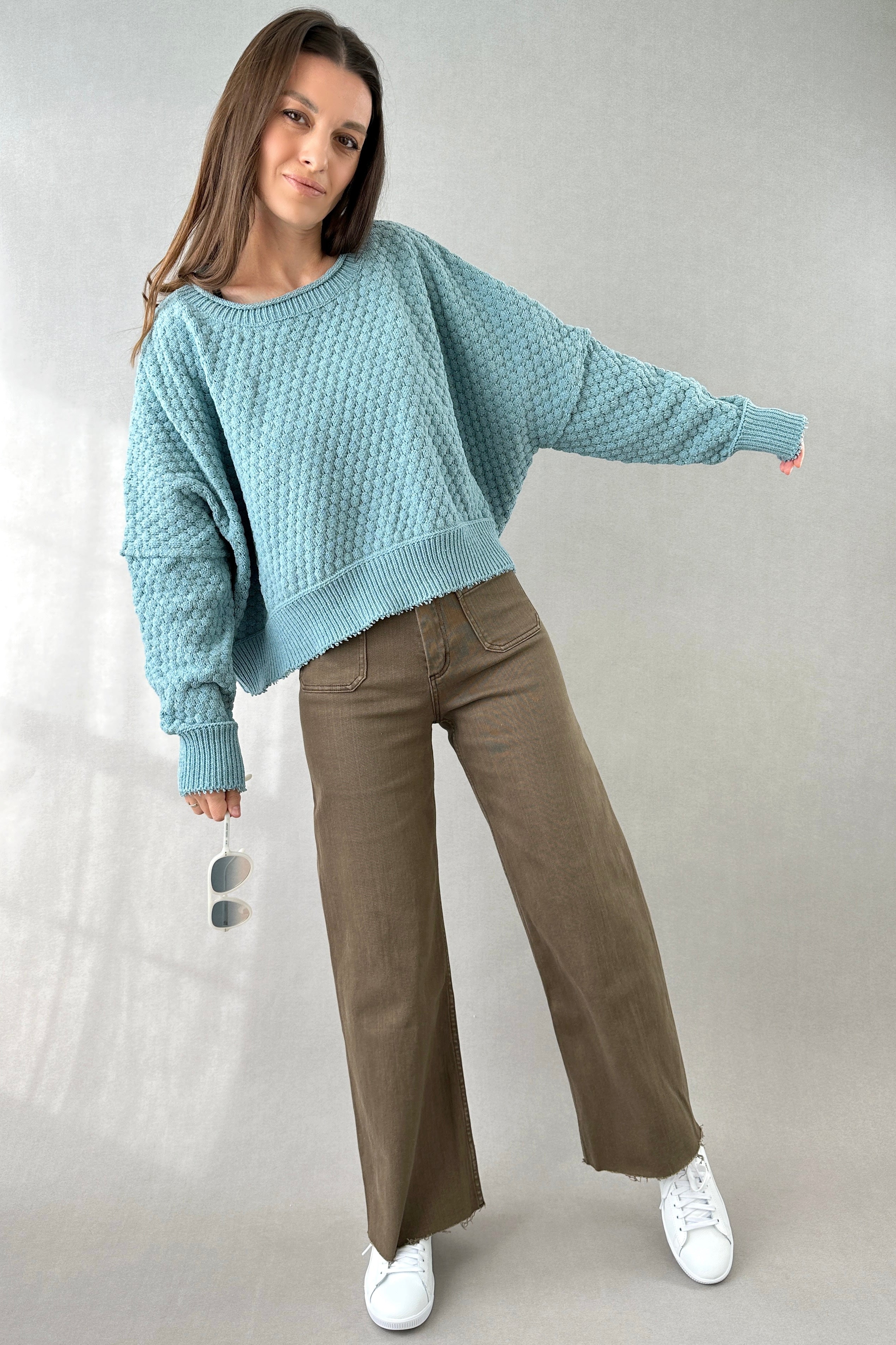 Wrap yourself in the cozy embrace of our ribbed solid knit sweater. Textured detailing throughout adds a touch of depth to the simple elegance of the piece, while the long dropped sleeves and round neckline enhance its relaxed fit. It's a versatile sweater that promises both comfort and style on any given day.